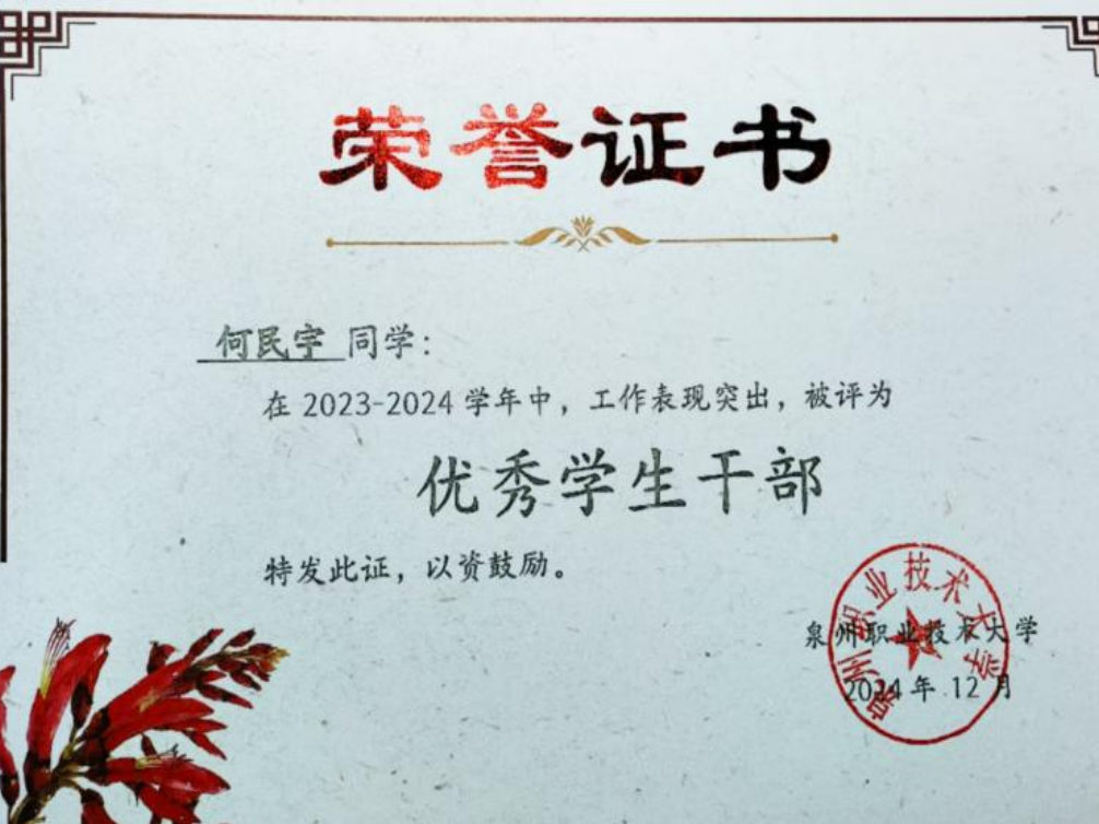 2024年12月 泉州职业技术大学 校级“优秀学生干部”;