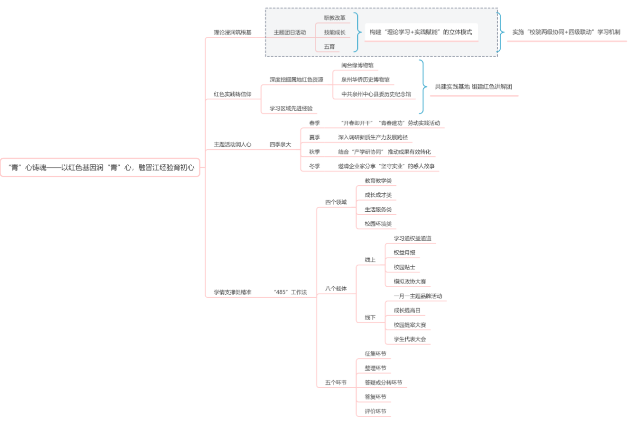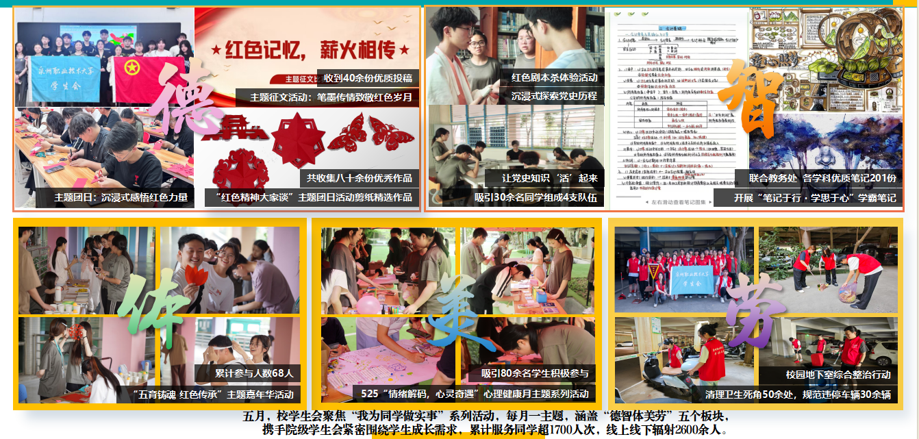 思想引领成效扎实,以“晋江经验”与职教改革为核心,开展120余场主题团课、45场“四季泉大”文化活动及多场红色实践,累计覆盖学生超1.4万人次。红色讲解团走进各类场馆提供志愿讲解超5万人次,举办思政微课大赛,累计收到35份参赛作品,通过“485”工作法精准输出12份学情报告,让思政服务贴合学生需求,学生对职业教育的认同感与地域精神的归属感显著提升。