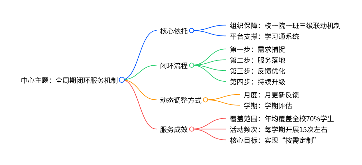 依托“校—院—班”三级联动机制和“学习通”系统,建立“需求捕捉—服务落地—反馈优化—持续升级”闭环,通过“月更新反馈、学期评估”动态调整服务,年均覆盖全校70%学生,每学期开展15次左右活动,实现“按需定制”。