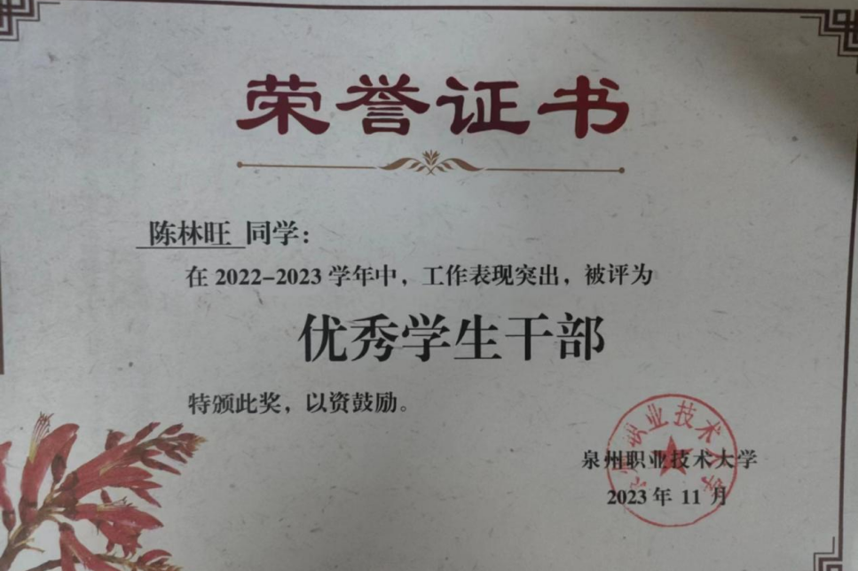 为回馈院校培养,陈林旺亦积极参加学生工作,为学院及学校建设添砖加瓦。他于2024年6月入选福建省禁毒宣讲员,自入学以来前往红色基地、中小学累计开展大型宣讲活动22场,服务人数3556余人次。在校担任学生干部期间,组织校园文化活动30余场,服务学生8136余人次,例如福建省职业教育周会场、内坑镇草地音乐节、迎新晚会等,每一次的活动他都与志愿者出色完成现场工作。在宣讲员的工作中,陈林旺参与多次重大活动的讲解工作,积极宣传、弘扬红色文化和禁毒文化。