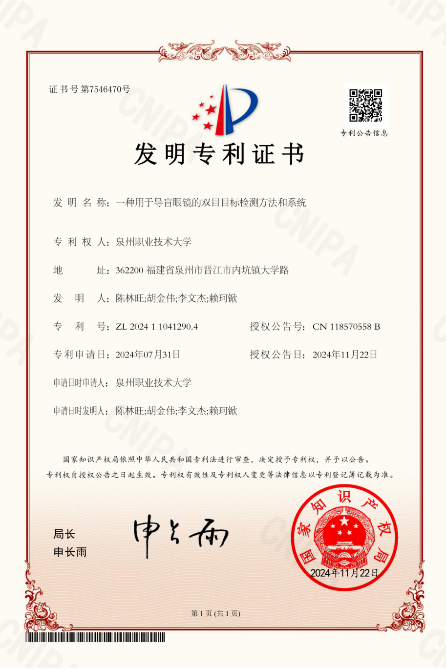 2024年10月 国家知识产权局 发明专利“一种用于导盲眼镜的双目目标检测方法和系统”,第一发明人;