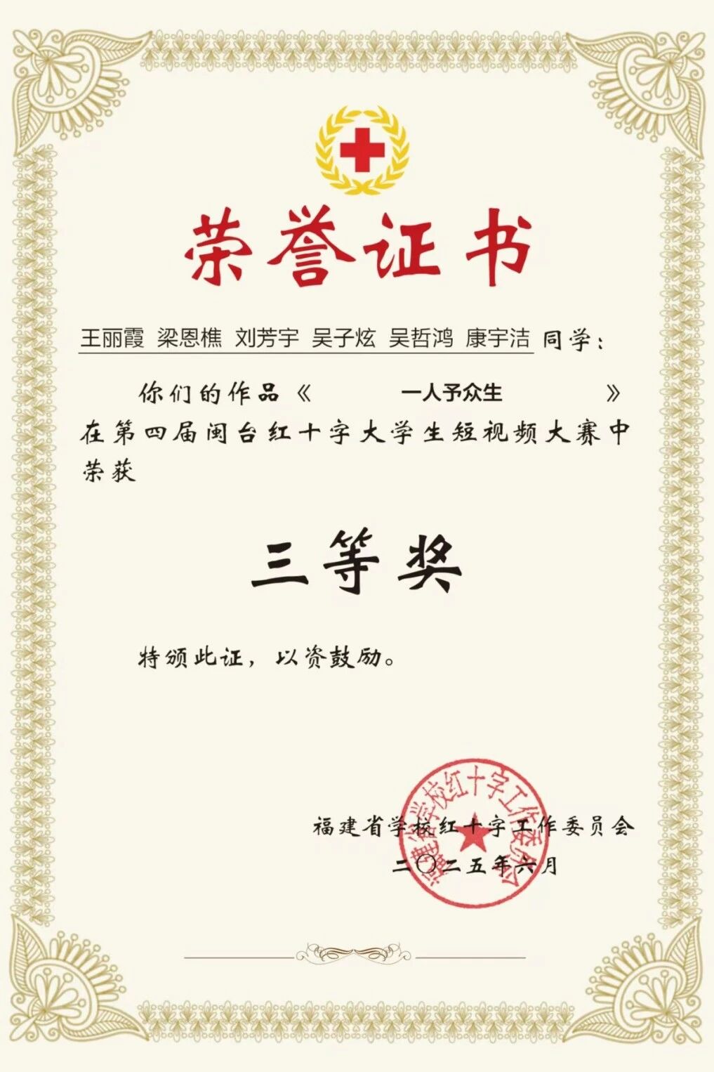 2025年6月 福建省学校红十字工作委员会 第四届闽台红十字大学生短视频大赛三等奖;