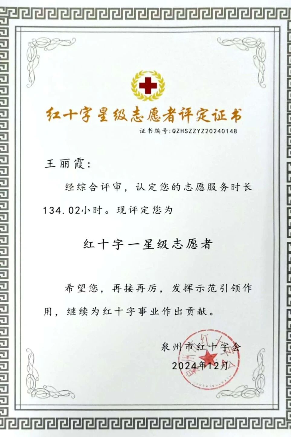2024年12月 泉州市2024年度“红十字一星级志愿者”;