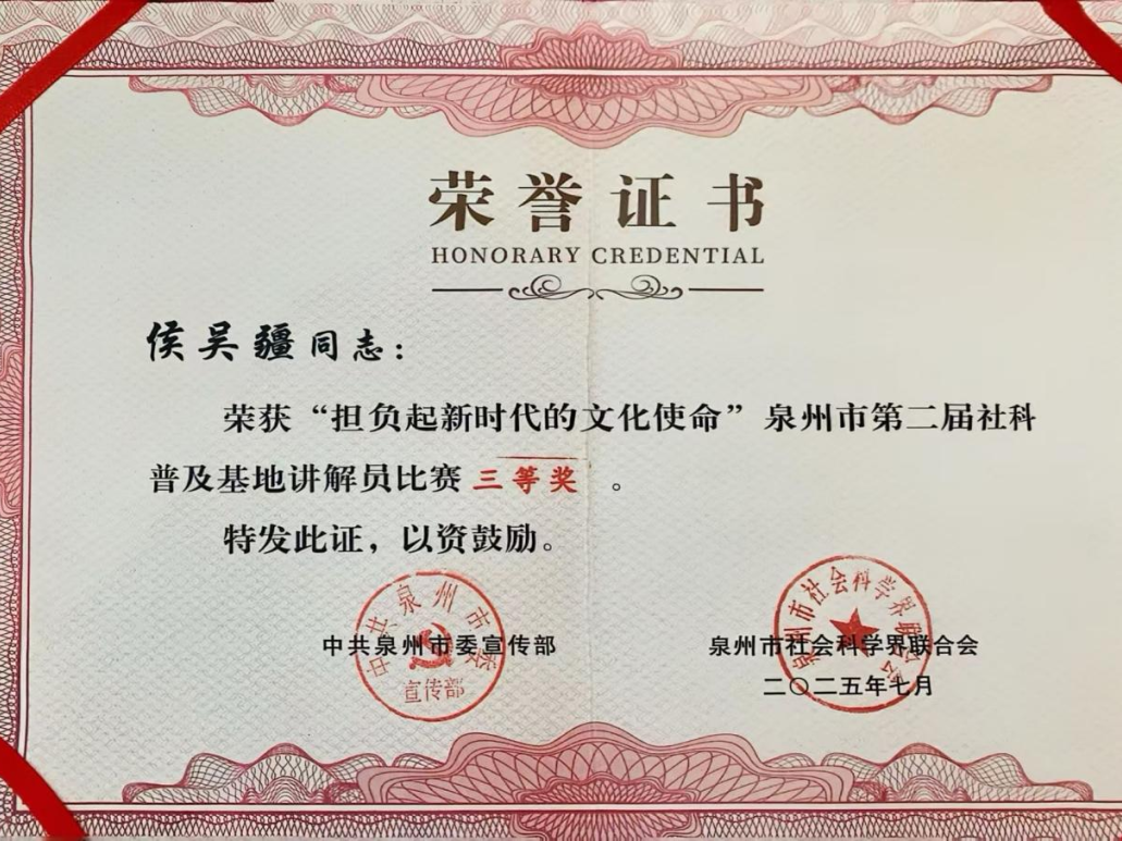 2024—2025学年,“担负起新时代的文化使命”泉州市第二届社科联及基地讲解员比赛中荣获三等奖;