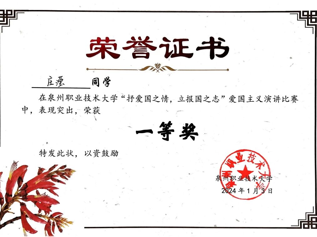 2024年01月 泉州职业技术大学“抒爱国之情,立报国之志”爱国主义演讲比赛获得“一等奖”;