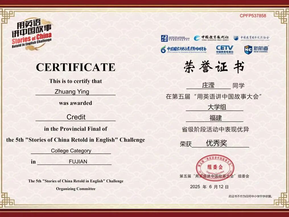 2025年04月 福建省第五届“用英语讲好中国故事大会” 获得优秀奖;