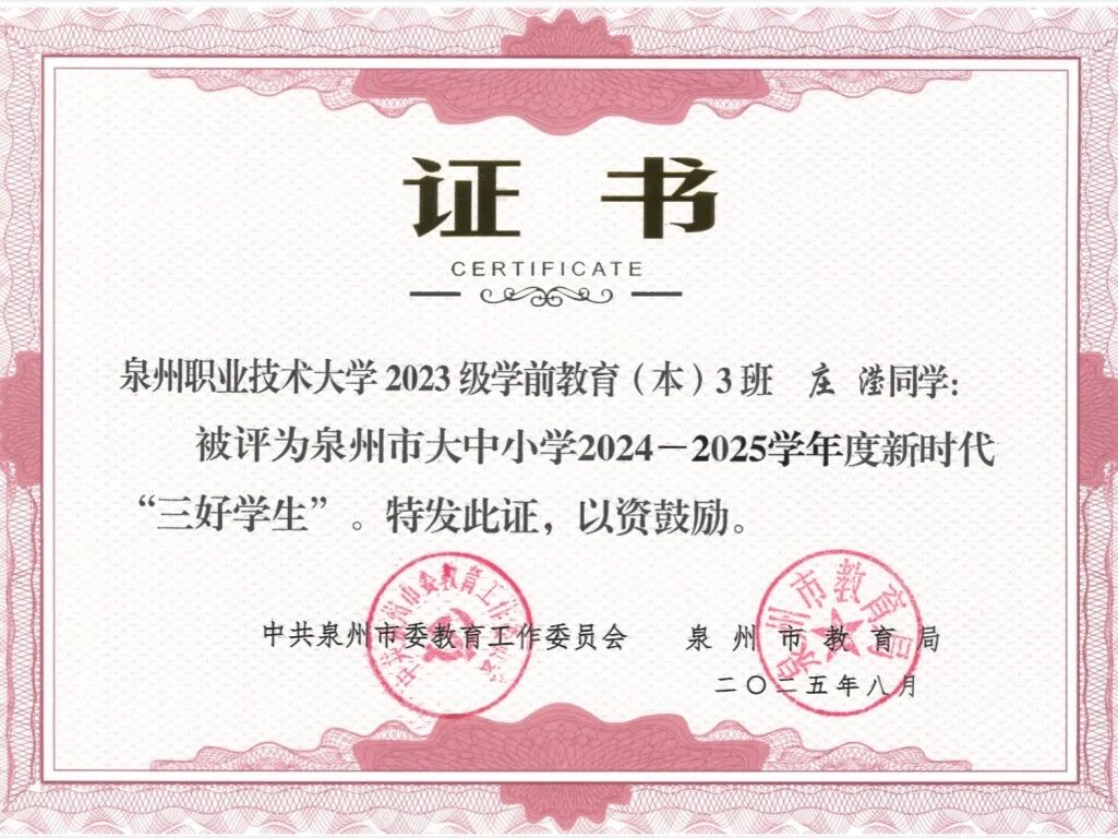 2025年08月 泉州市“三好学生”荣誉称号;
