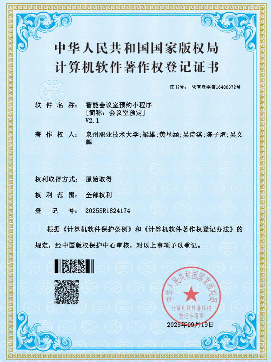2025年09月 获《智能会议室预约审批系统》《智能会议室预约数据调度平台》《智能会议室预约小程序》3项软件著作权。