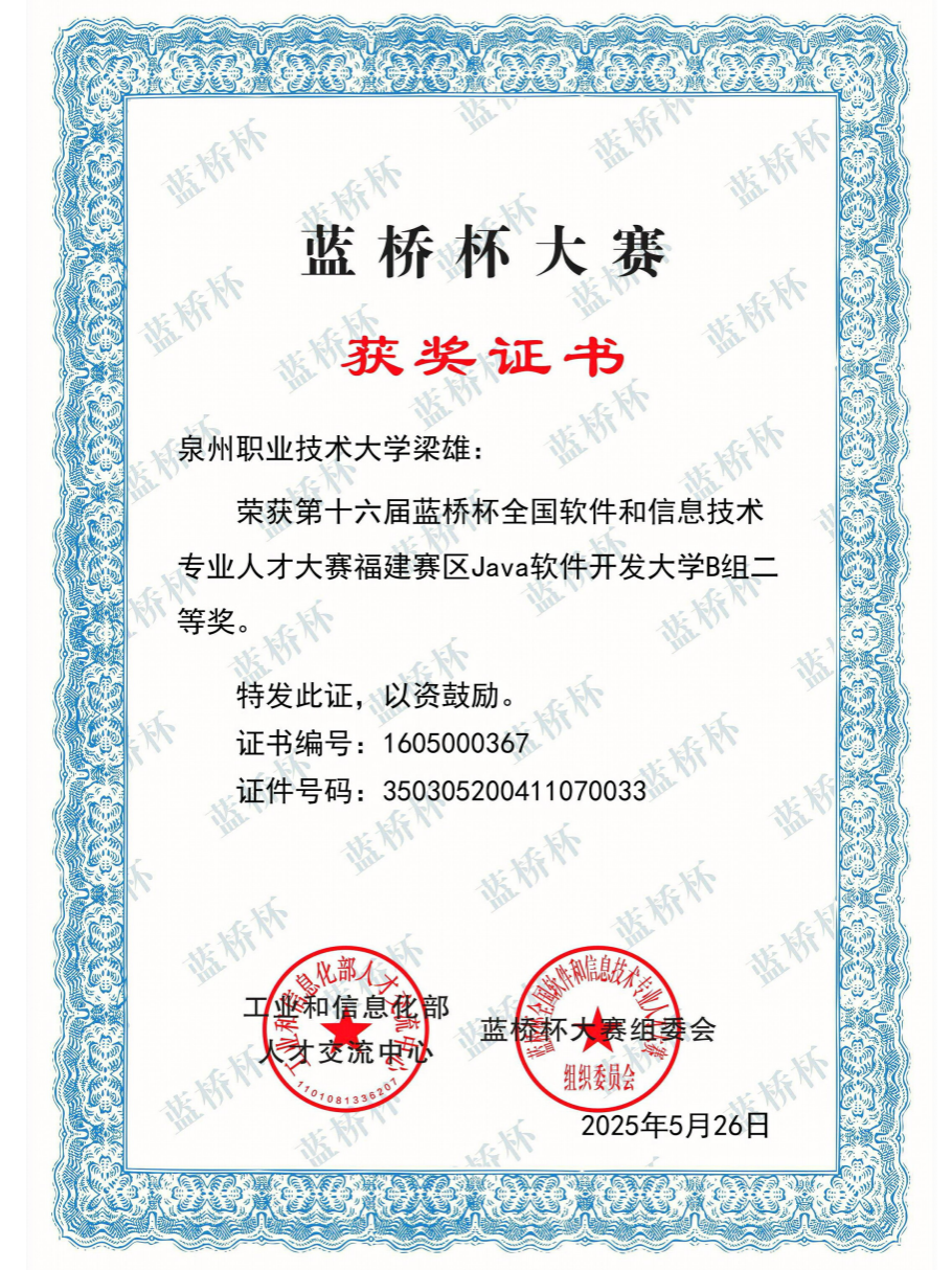 2025年05月 第16届蓝桥杯全国软件和信息技术专业人才大赛福建赛区Java软件开发大学B组二等奖;
