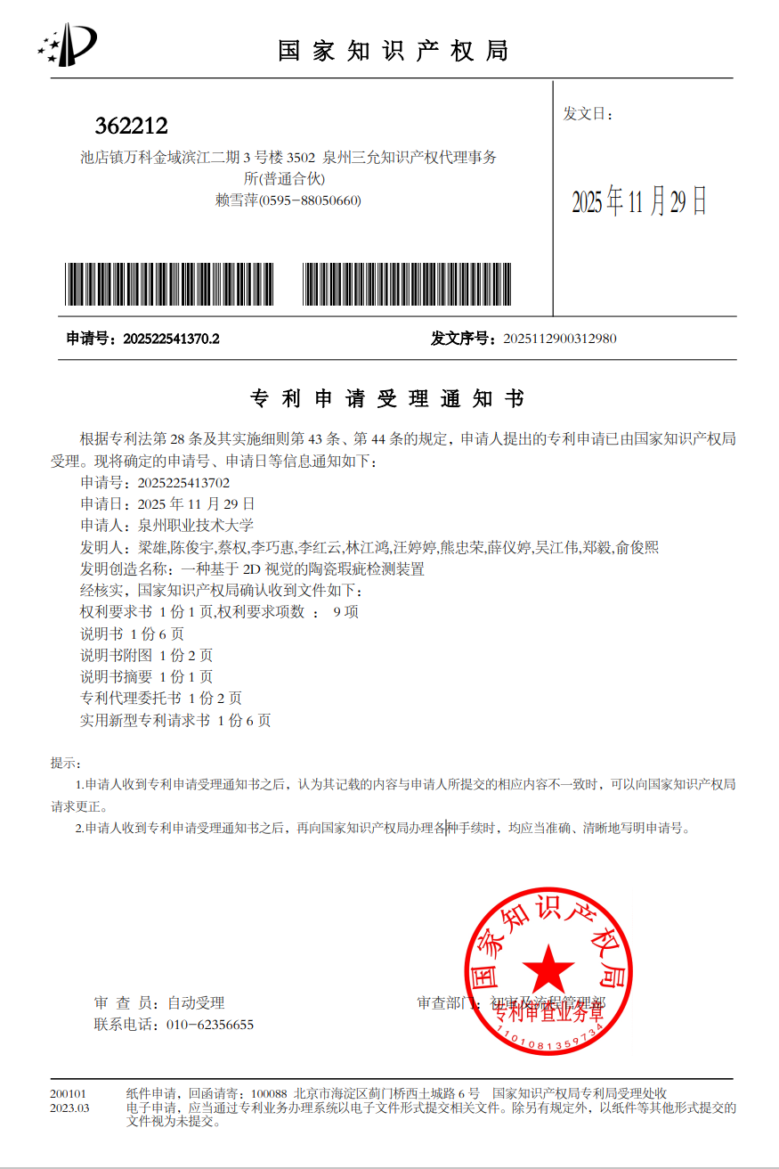 2025年11月 国家知识产权局 实用新型专利“一种基于 2D 视觉的陶瓷瑕疵检测装置 ”(受理中);