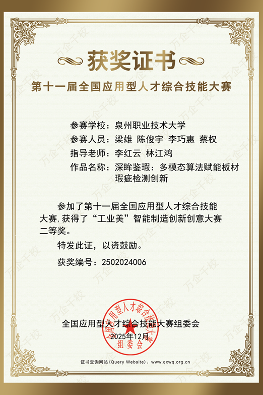 2025年11月 项目《深眸鉴瑕:多模态算法赋能板材瑕疵检测创新》获第十五届海峡两岸信息服务创新大赛二等奖;