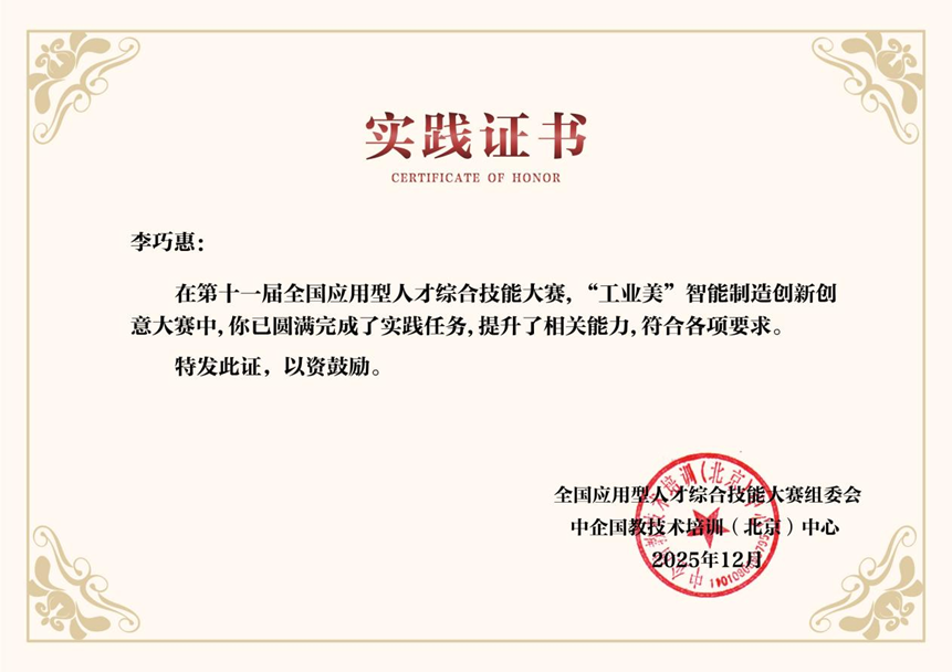 2025年12月 参加第十一届全国应用型人才综合技能大赛,获“工业美”智能制造创新创意大赛二等奖;