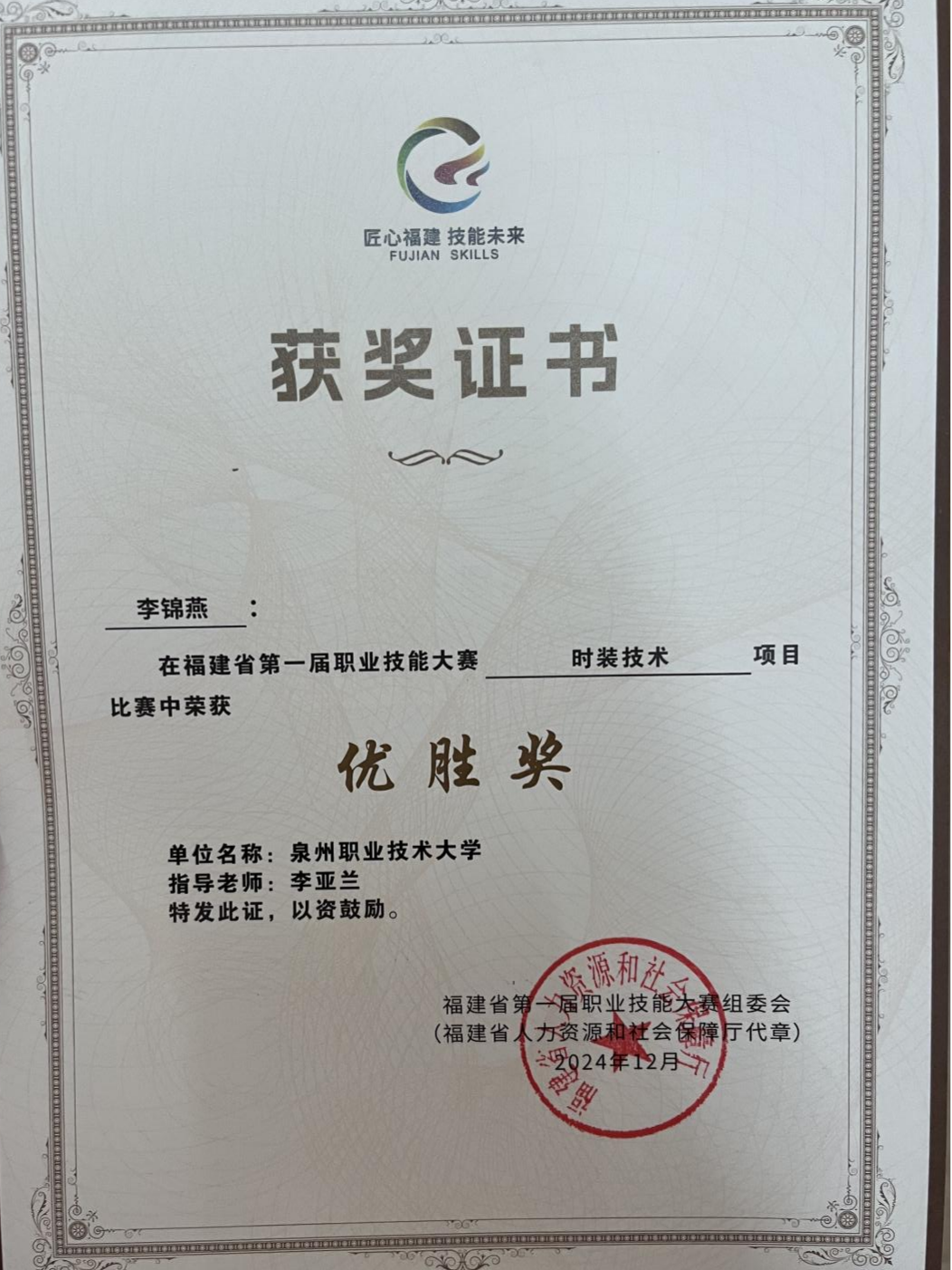 2024年12月 福建省职业技能大赛时装技术赛项“第8名”;