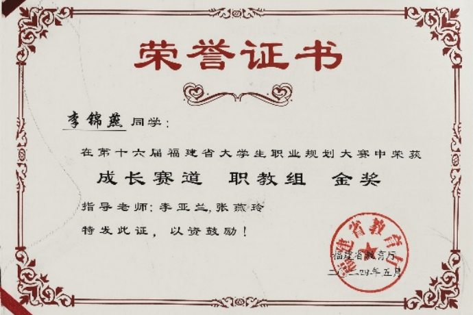 2024年4月 福建省大学生职业规划大赛“金奖”;
