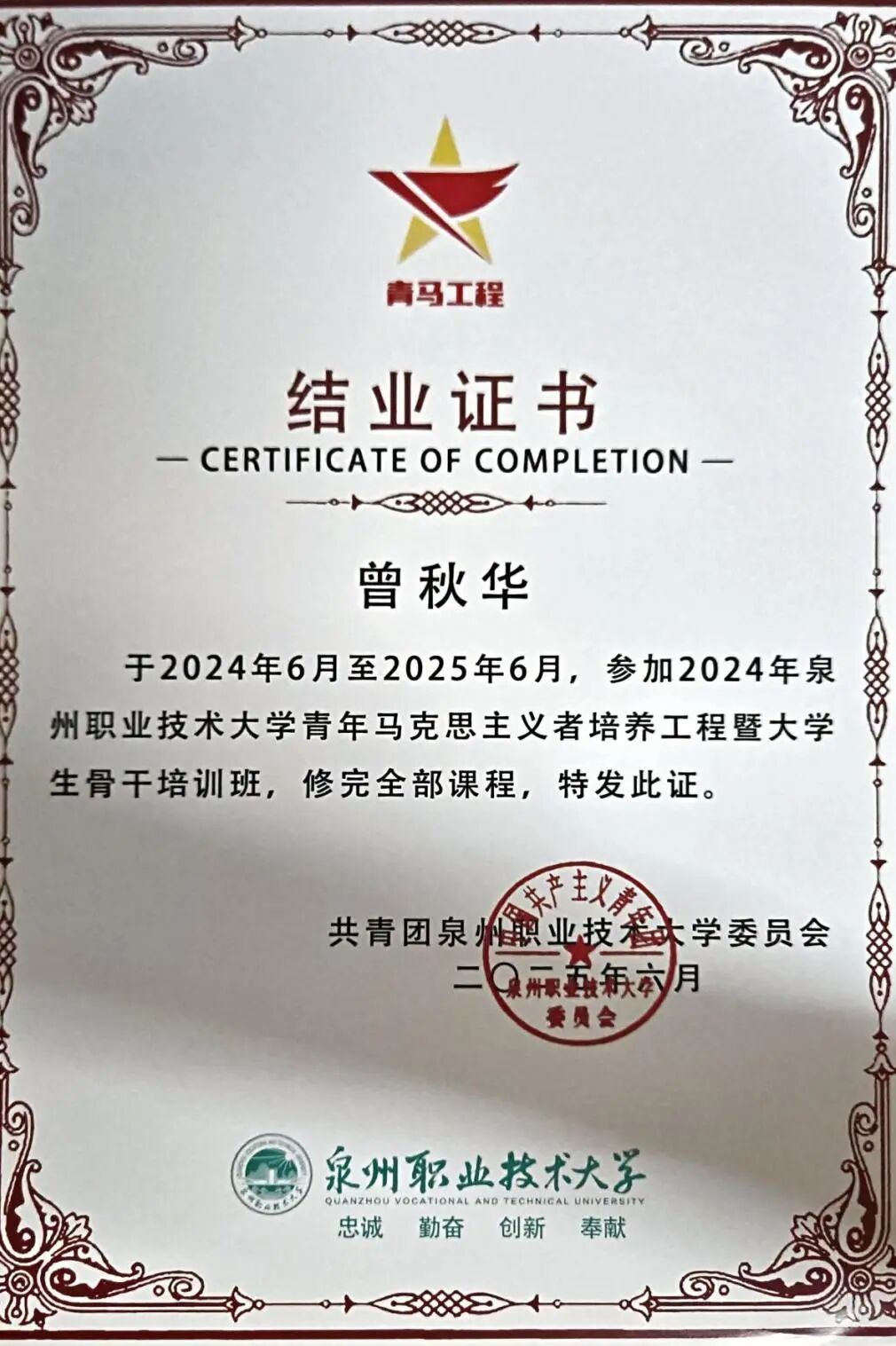 2025年06月 2024年泉州职业技术大学青年马克思主义者培养工程暨大学生骨干培训班结业证书;