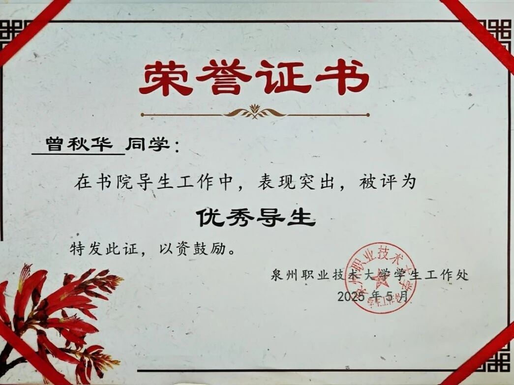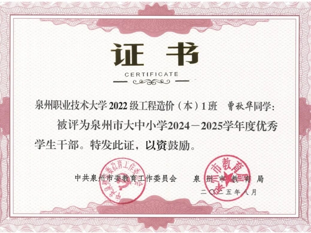 2023年11月 泉州职业技术大学“优秀学生干部”;