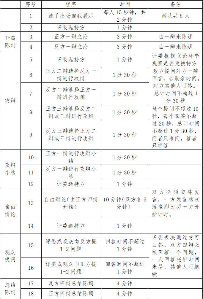 6.在自由辩论时间里,每一位辩手的发言次序、次数和时间都不受限制。双方必须交替发言,一方发言结束落坐即为另一方计时。一方时间用尽后另一方可连续发言。禁止在一方发言未结束时另一方强行发言,禁止一方在另一方时间未尽时连续发言。