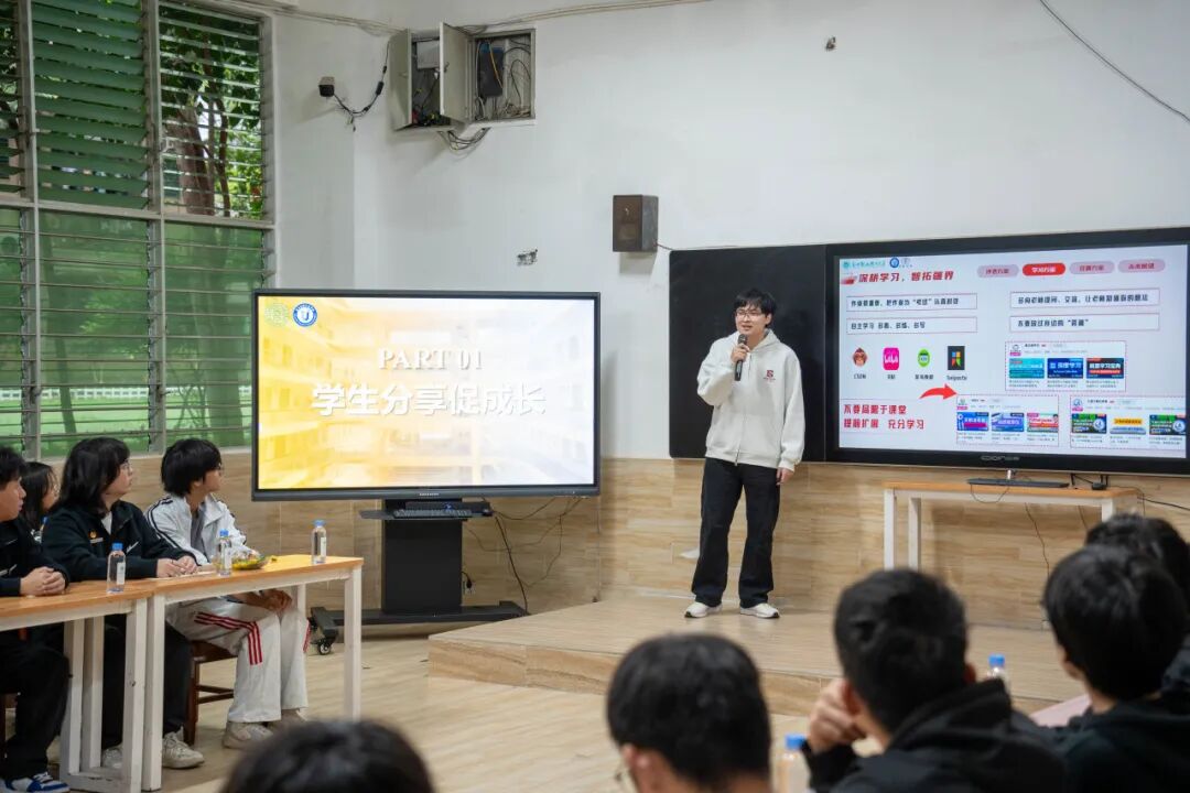 学生分享环节,2023级计算机应用工程专业梁雄同学围绕“打破信息差”这一主题,从评选、学习与竞赛三方面为同学们带来实用指引。多维度对自身的发展经历进行剖析,分享“多看、多练、多写”的学习方法;并推荐多项重点赛事与备赛平台,提倡“以赛促学”的学习方法,有效的帮助同学们明晰发展方向。