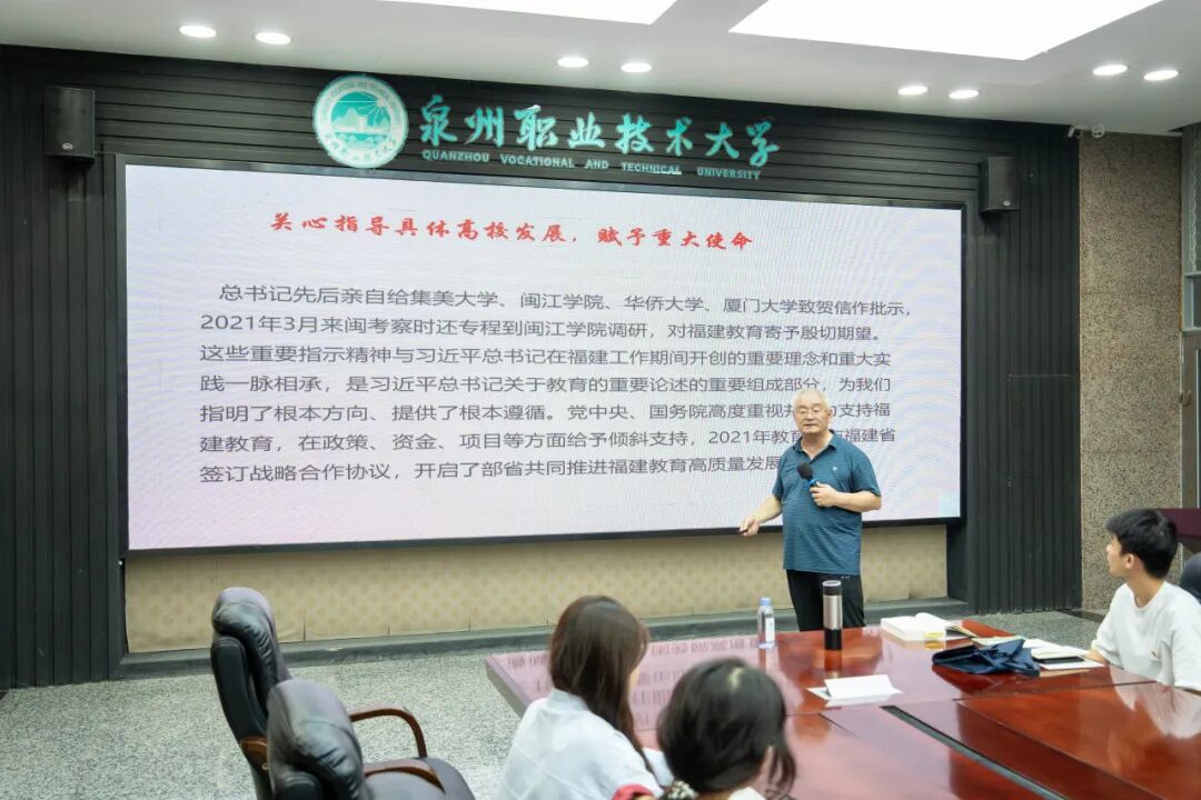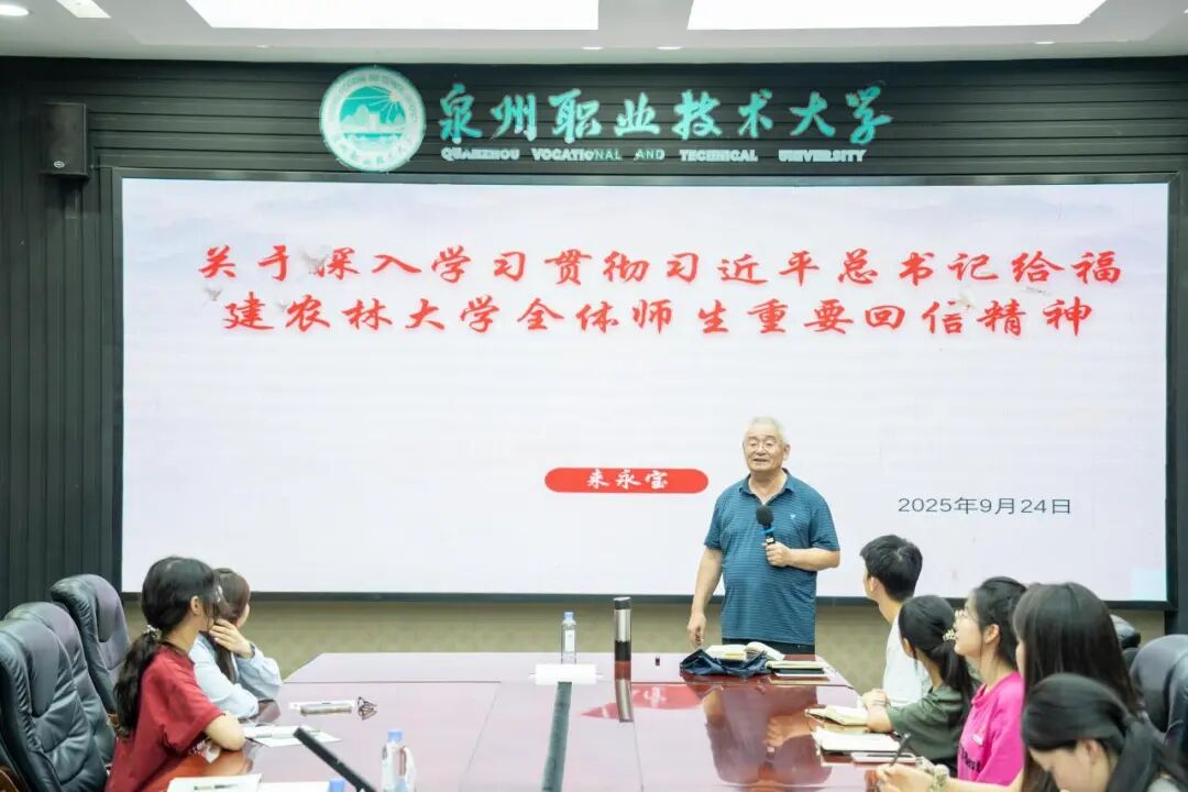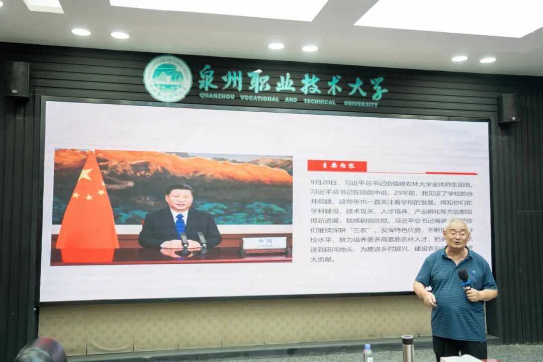 为深入学习贯彻习近平总书记给福建农林大学全体师生的回信精神,一善书院邀请泉州职业技术大学校务顾问/马克思主义学院首席专家来永宝教授为书院师生讲授专题思政课,共同学习重要回信精神。