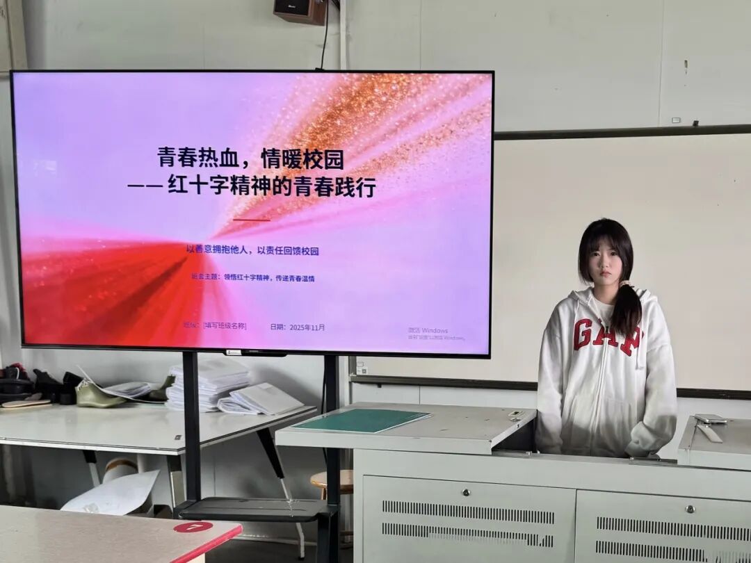 班会上,主持人以“献血与青春”为核心,通过PPT展示结合案例的方式,解读了无偿献血的深层价值。同时,主持人结合校园公益理念,解读了青年献血与校园温暖的紧密关联——青春的意义不仅在于逐梦前行,更在于力所能及的守望相助,用可再生的血液传递不可替代的温暖,正是青年担当的生动诠释。