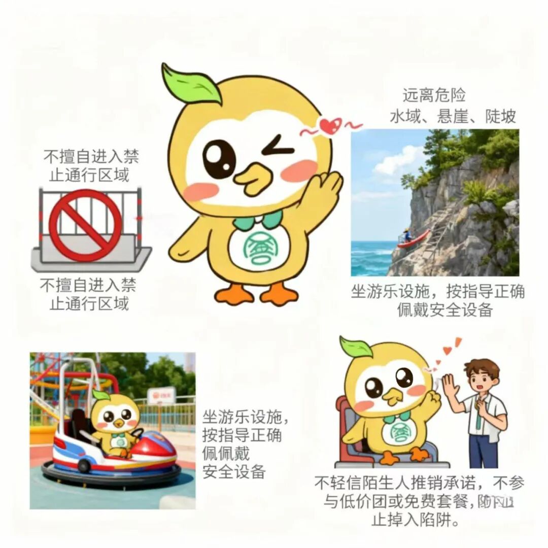 不擅自进入禁止通行区域,远离危险水域、悬崖、陡坡。坐游乐设施,按指导正确佩戴安全设备。不轻信陌生人推销承诺,不参与低价团或免费套餐,防止掉入陷阱。