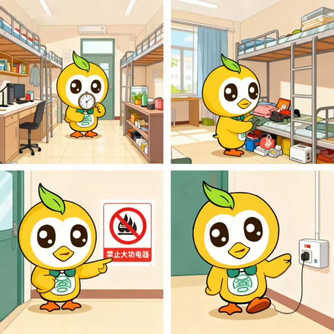 部分同学国庆留校,严格遵守作息,保持宿舍整洁,营造舒适环境。宿舍禁用大功率电器,防止引发火灾。注意用电安全,不私拉乱接电线,离开宿舍关闭所有电器电源。