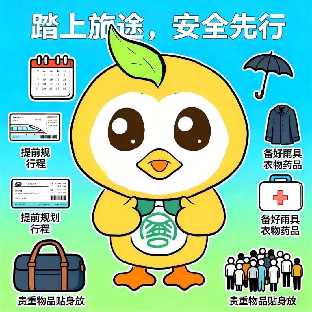 国庆出行高峰,提前规划行程,查好车票机票,选好时间工具。备好雨具、保暖衣物与常用药品,应对突发状况。贵重物品贴身放,人员密集处,保持警惕,留意周围。
