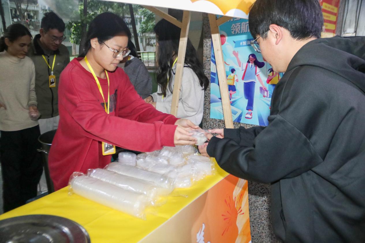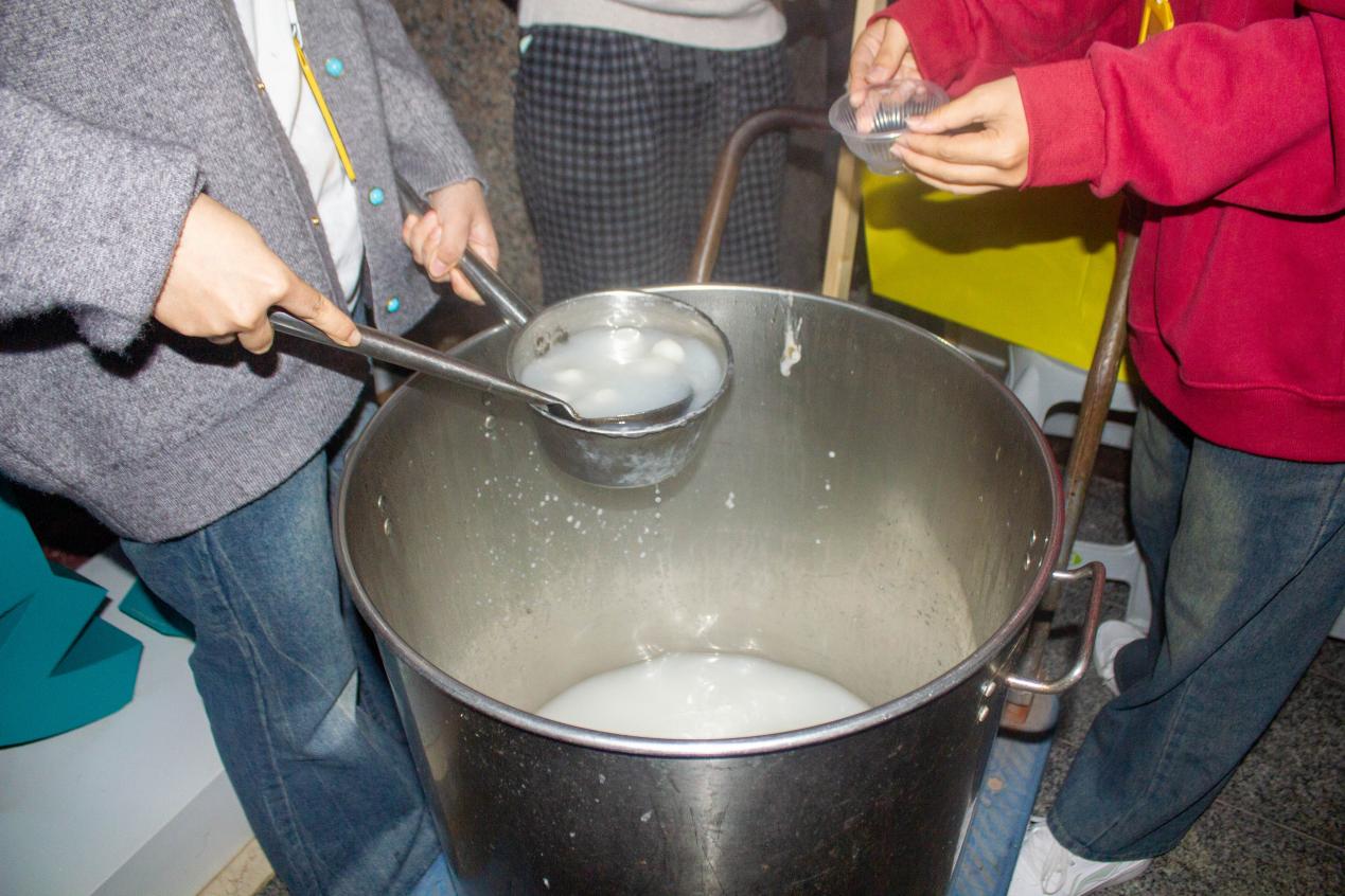 另一边的煮汤圆环节同样热闹非凡。工作人员将一颗颗圆润的汤圆下入沸水,待汤圆浮起、香气四溢时,盛进碗中递到师生手中。热气腾腾的汤圆入口软糯,驱散了冬日的寒意,更拉近了师生间的距离,让留校学子感受到“家”的温暖。