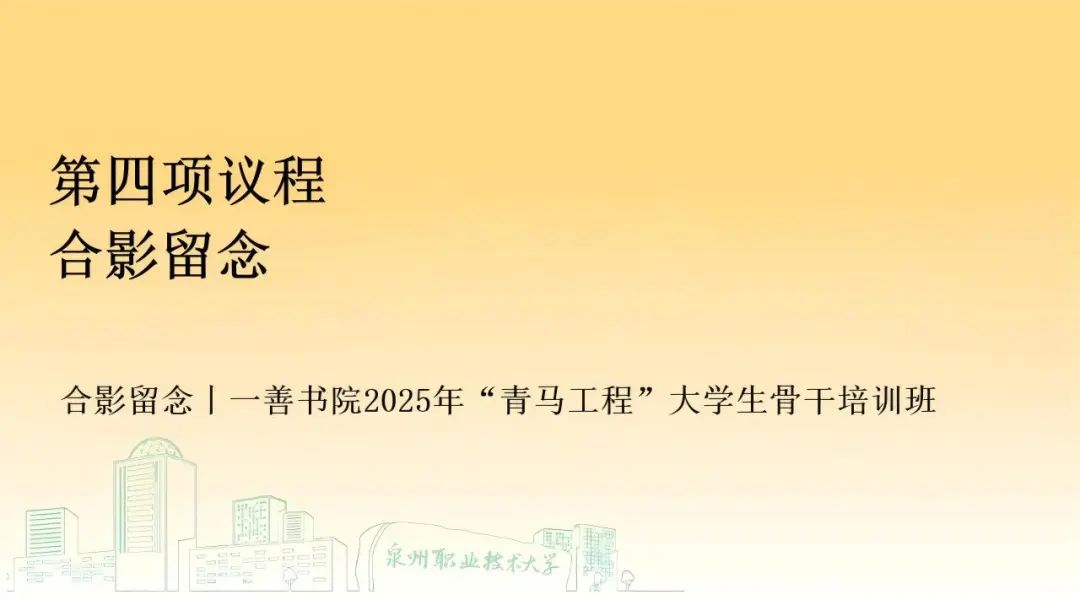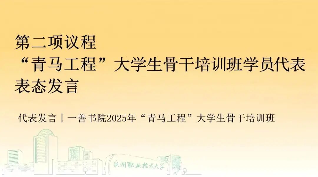 本次一善书院2025年“青马工程”大学生骨干培训班开班仪式至此圆满结束!未来,一善书院全体青年学生骨干将始终践行书院“向上向善”的育人理念,以昂扬姿态投入学习与实践,努力成长为有理想、敢担当、能吃苦、肯奋斗的新时代青年骨干,为书院“善文化” 传承、学校发展与青年工作贡献青春力量。