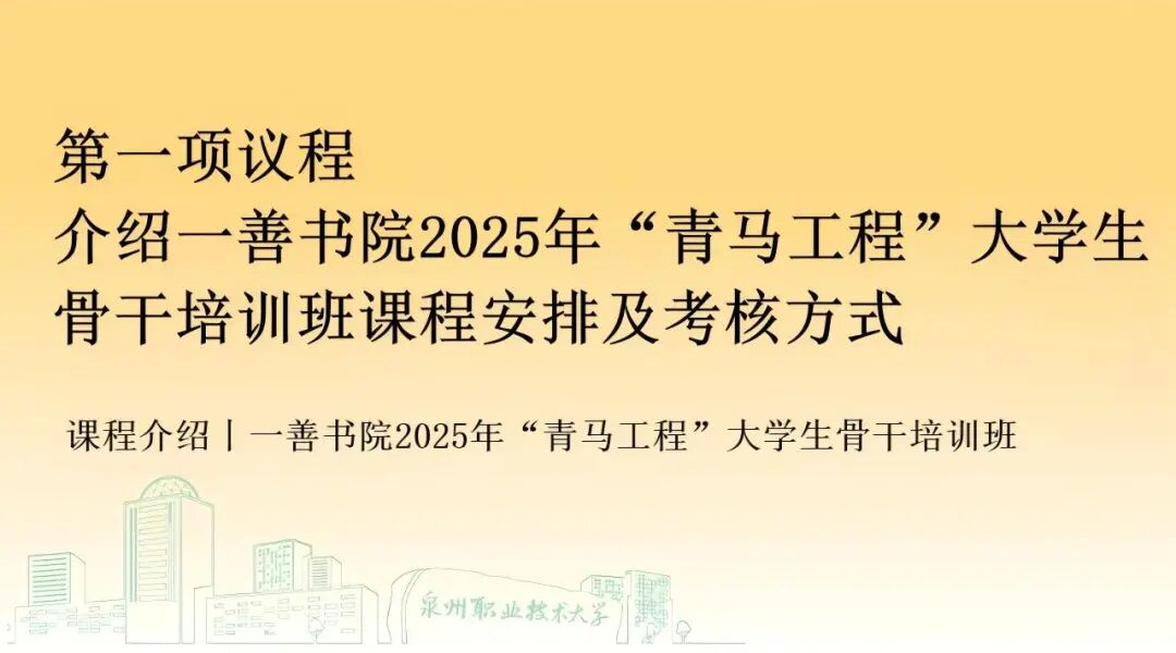 为深入学习贯彻党的二十大和二十届三中全会精神,发挥共青团工作职能,着力为党培养和输送青年政治骨干,落实立德树人根本任务,进一步提升书院学生骨干的理论素养与工作能力,引导其坚定“向上向善”价值导向,一善书院团委决定举办2025年“青马工程”大学生骨干培训班。