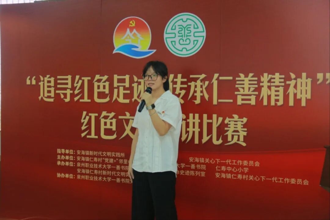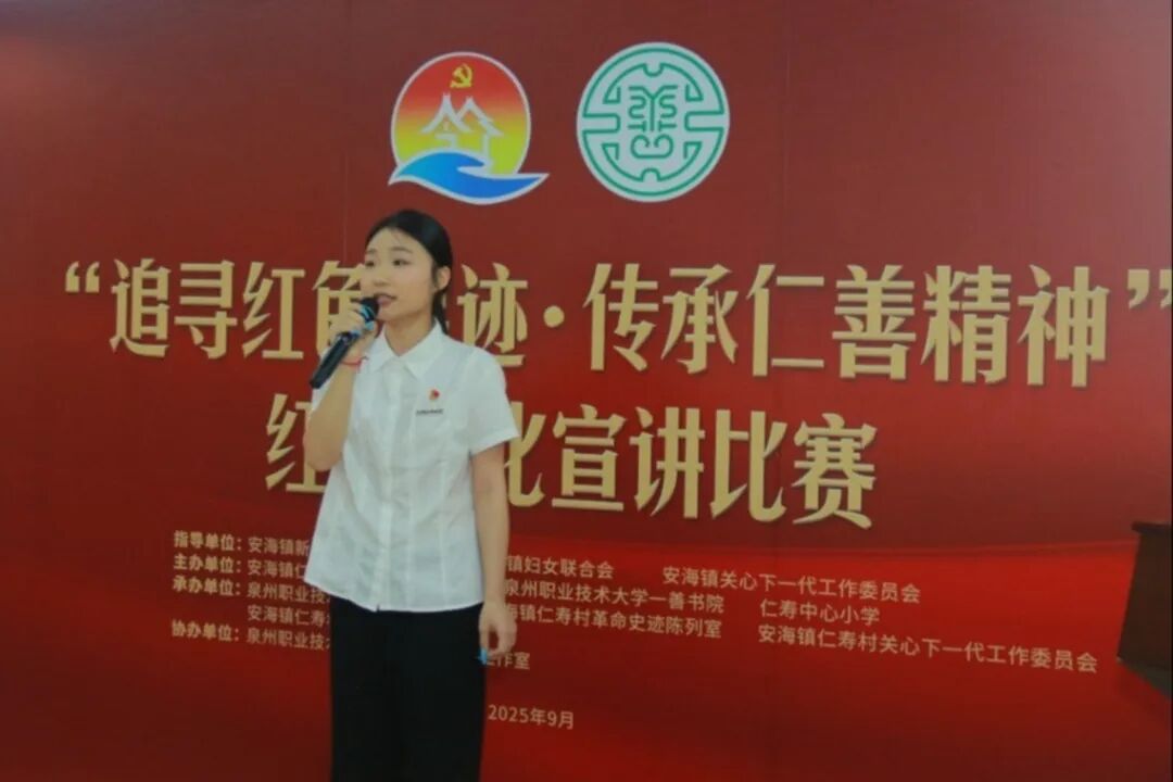 为深入贯彻落实习近平新时代中国特色社会主义思想,用好红色资源、传承红色基因,2025年9月17日下午,“追寻红色足迹・传承仁善精神”红色文化宣讲比赛决赛在晋江市安海镇仁寿村成功举办。本次活动由安海镇仁寿村“党建+”邻里中心、泉州职业技术大学一善书院、仁寿中心小学联合主办,旨在以宣讲之力传承红色精神,筑牢青年理想信念之基。