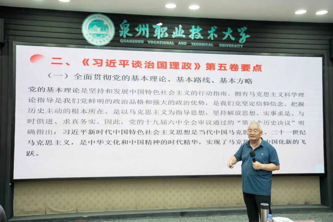 为深入学习贯彻《习近平谈治国理政》第五卷的关键要义,2025年9月24日晚 19:00,泉州职业技术大学校务顾问、马克思主义学院首席专家来永宝教授,在学校第一会议室以“伟大旗帜指引方向,青春绽放绚丽之花”为主题,为一善书院青马工程学员讲授专题思政课。本次课程以提升学生干部政治素养与工作能力为目标,旨在助力学员在学生组织中切实履行引领职责,进一步夯实理论根基。