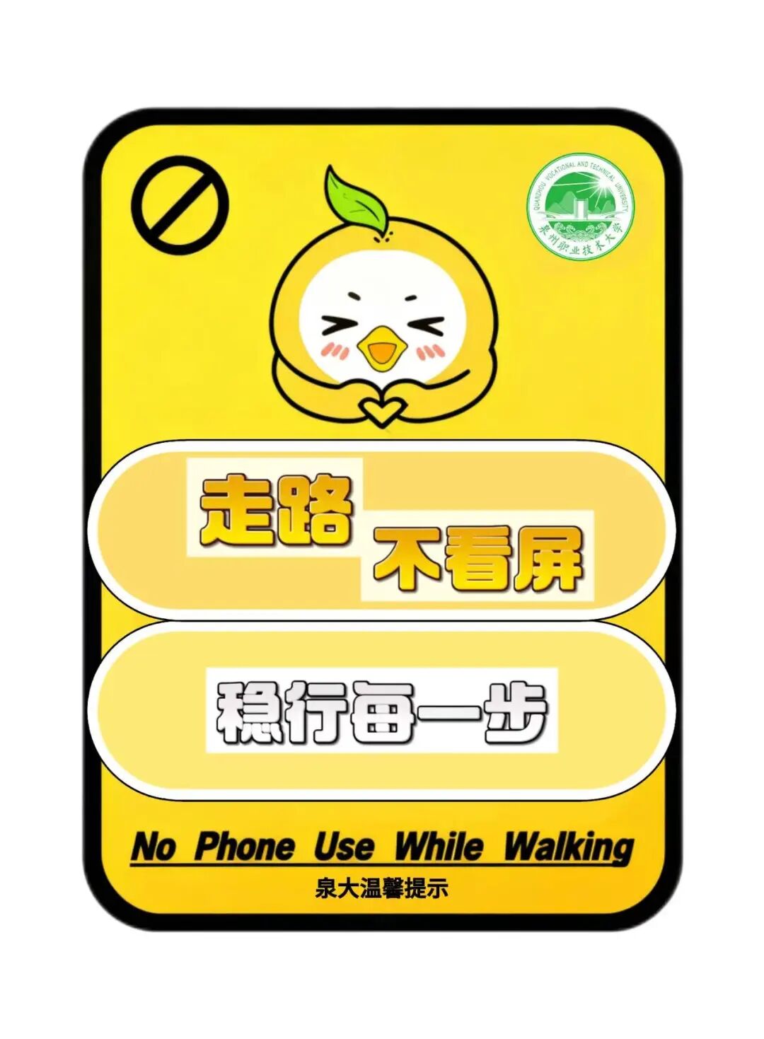在“主人周”活动中,24服设2班的同学们充分发挥专业的审美优势,精心打造系列“拒绝低头玩手机”主题安全警示牌,以鲜明色彩搭配生动场景,既直观传递“走路不低头,校园更安全”的安全警示,又融入青春设计感,让安全理念以鲜活的视觉形式深入人心。