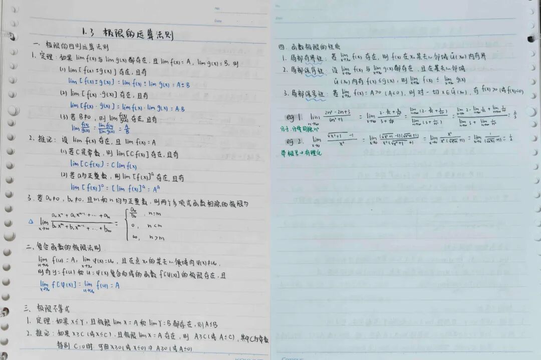 极限笔记是我课上跟着老师拆解的“知识工具包”:把四则运算的抽象法则,配了例题标清用法——像等价无穷小标了“乘除换、加减不换”的口诀。记的时候特意把易混点用红笔标注,做题时翻笔记能直接对应题型,既省了翻书时间,也把零散的知识点串成了能落地的解题逻辑。