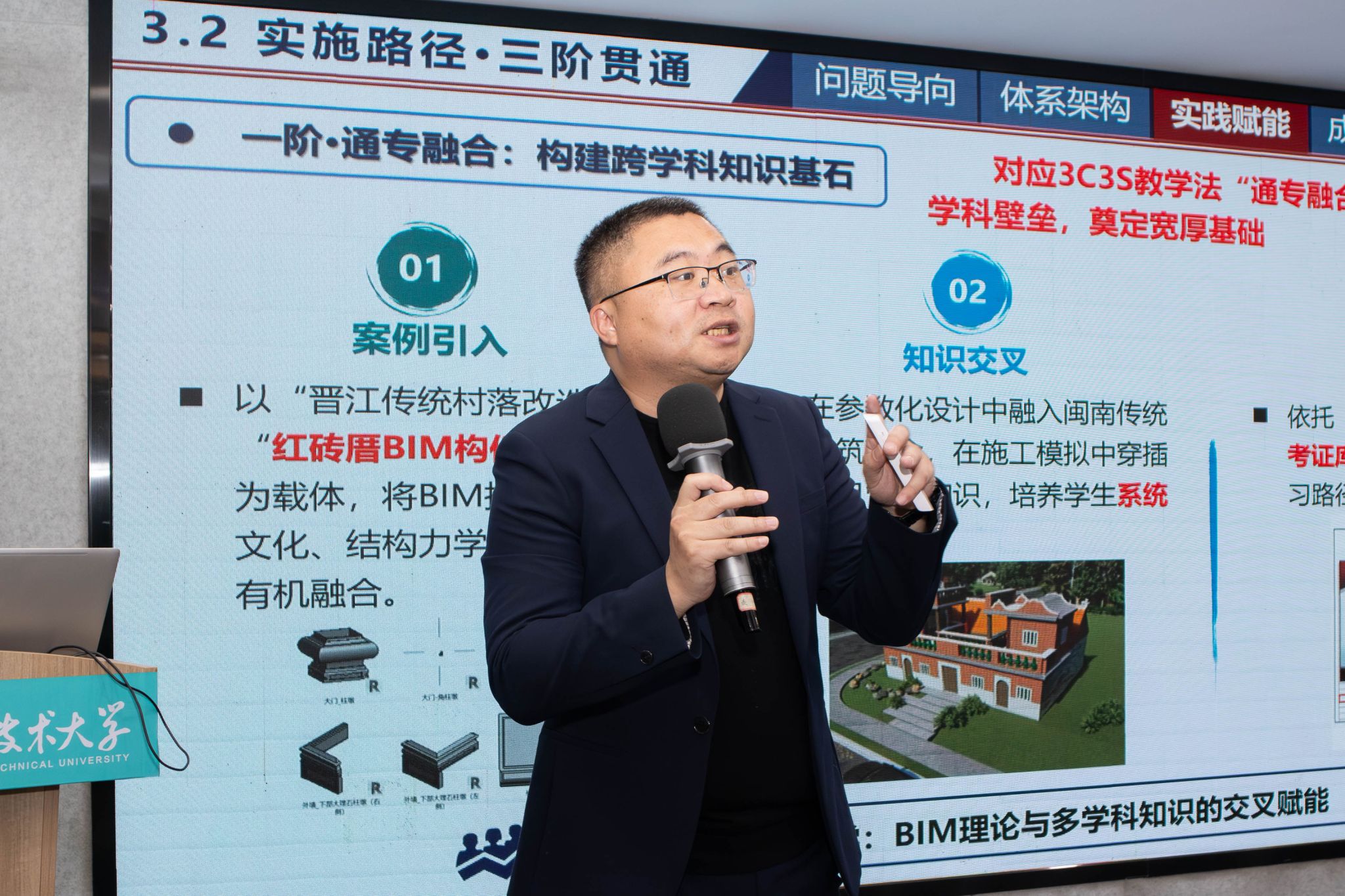 “数匠融合”教学创新团队负责人陈培源副教授以“543”产教融合理念为指导,系统阐述了“3C3S”教学法的实施框架,强调以“五业联动”为引领、“四大板块”为支撑,推动教学从知识传授向能力养成转变。他以《BIM技术应用》课程为例,依托“闽南古厝保护性修缮”真实项目,分解为教学任务,落实“3C3S”教学法的以问题为中心的“理论精讲”、以技能为中心的“任务分训”、以学生为中心的“项目综做”,基于任务与数据双轮驱动的智慧教学,引导学生在解决实际问题中掌握课程教学核心技能。团队骨干林萍云老师在《工程经济学》课程中以“闽南古厝保护性修缮方案经济比选”为项目载体,重构课程内容,创新应用“3C3S”教学法,将岗证赛创有机融合,构建“学-练-用”递进式育人链条,将抽象的经济理论转化为可操作的工程决策过程,有效提升学生的专业技能、工匠精神和数字素养。