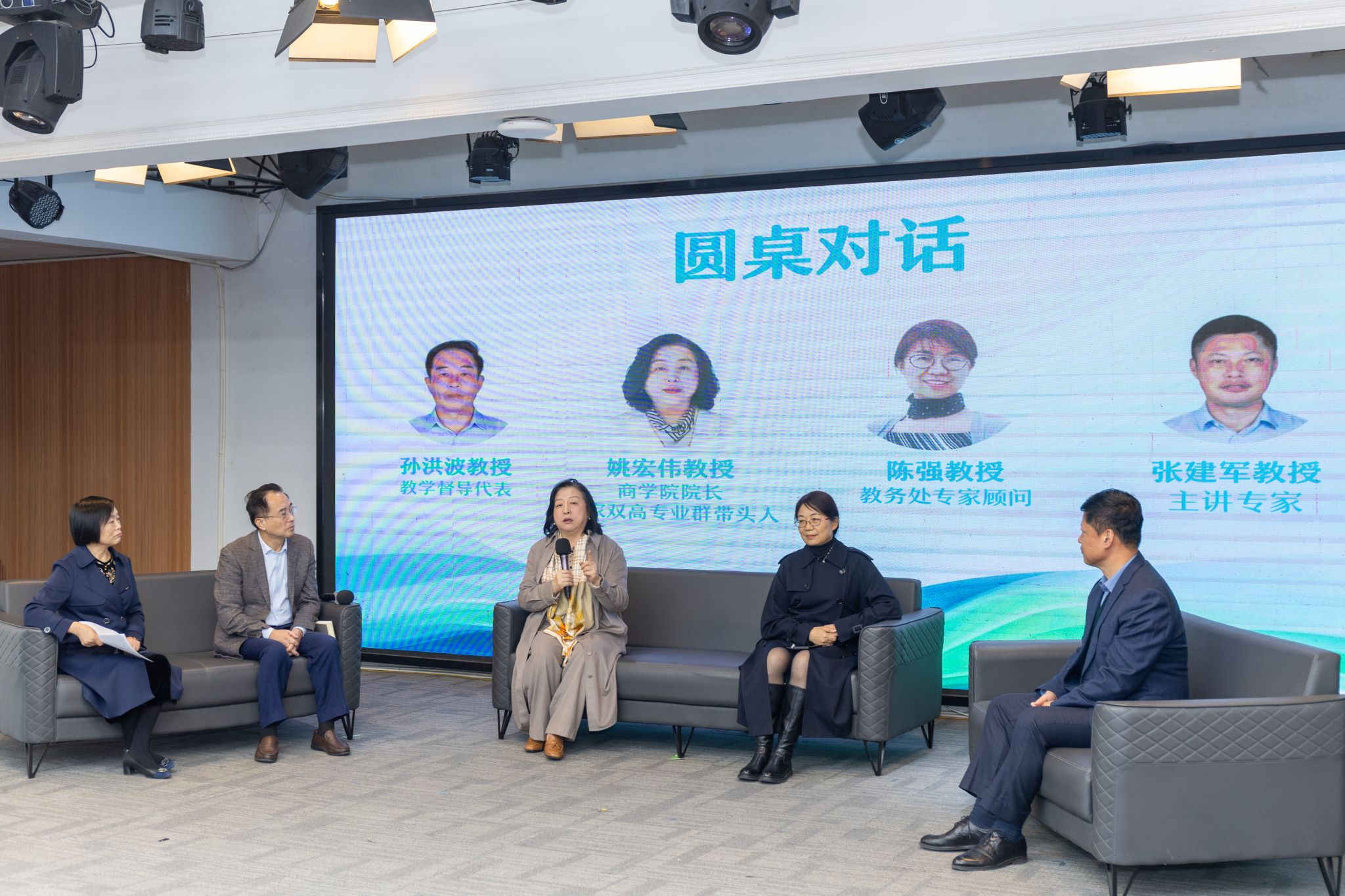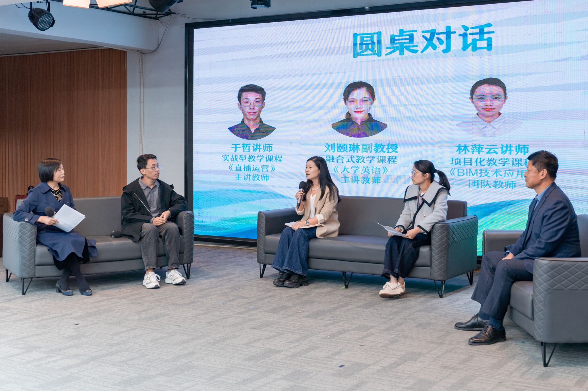 在随后的圆桌对话环节,三位一线教师结合各自课程分享了应用心得。刘颐琳副教授指出,“3C3S”教学法为《大学英语》实现通专融合提供了明确路径,并在与艺术专业的跨学科融合中成效显著;林萍云讲师认为,其“三段式”教学设计有效促进了《BIM技术应用》课程知识的系统整合,推动课堂形态向“以学生为中心、以问题为导向”转变;于哲讲师则表示,该教学法为《直播运营》等源于真实项目的课程提供了理论支撑与系统化构建方法。