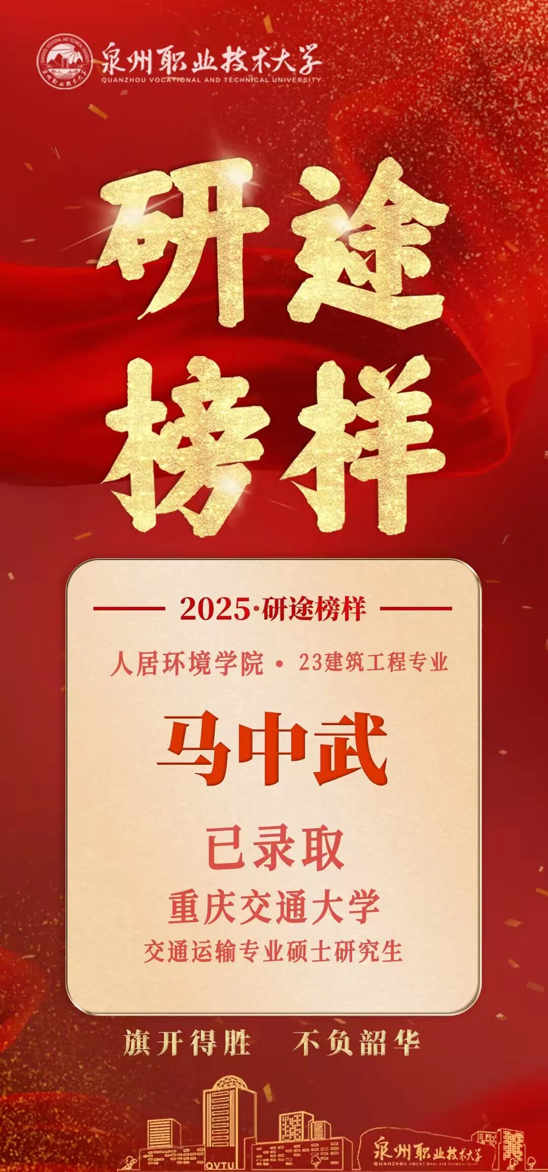马中武“学习如逆水行舟,不进则退,阳光总在风雨后。”所在学院:泉州职业技术大学·人居环境学院所在专业:建筑工程毕业去向:重庆交通大学考研心得分享很喜欢在备考的期间看到村上春树说的一句话:不必纠结当下,也不必太担忧未来,人生没有无用的经历,所以,一直走,天一定亮。好像考研是我从大一就有的计划,高考失利没有进入到自己喜欢的学校喜欢的专业,只能被迫走向专科,心里始终觉得我不应该止步于此,相较于其他同学...