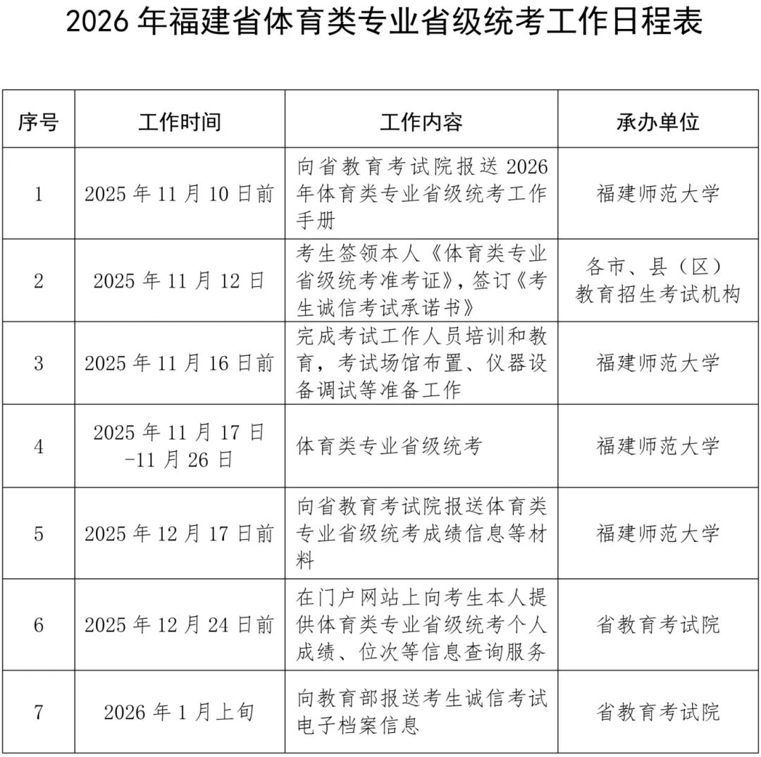 日前,省教育厅印发《关于做好2026年普通高校招生体育类专业省级统一考试工作的通知》,明确2026年福建省普通高校招生体育类专业省级统一考试(以下简称体育类专业省级统考)将于2025年11月17日-11月26日进行。