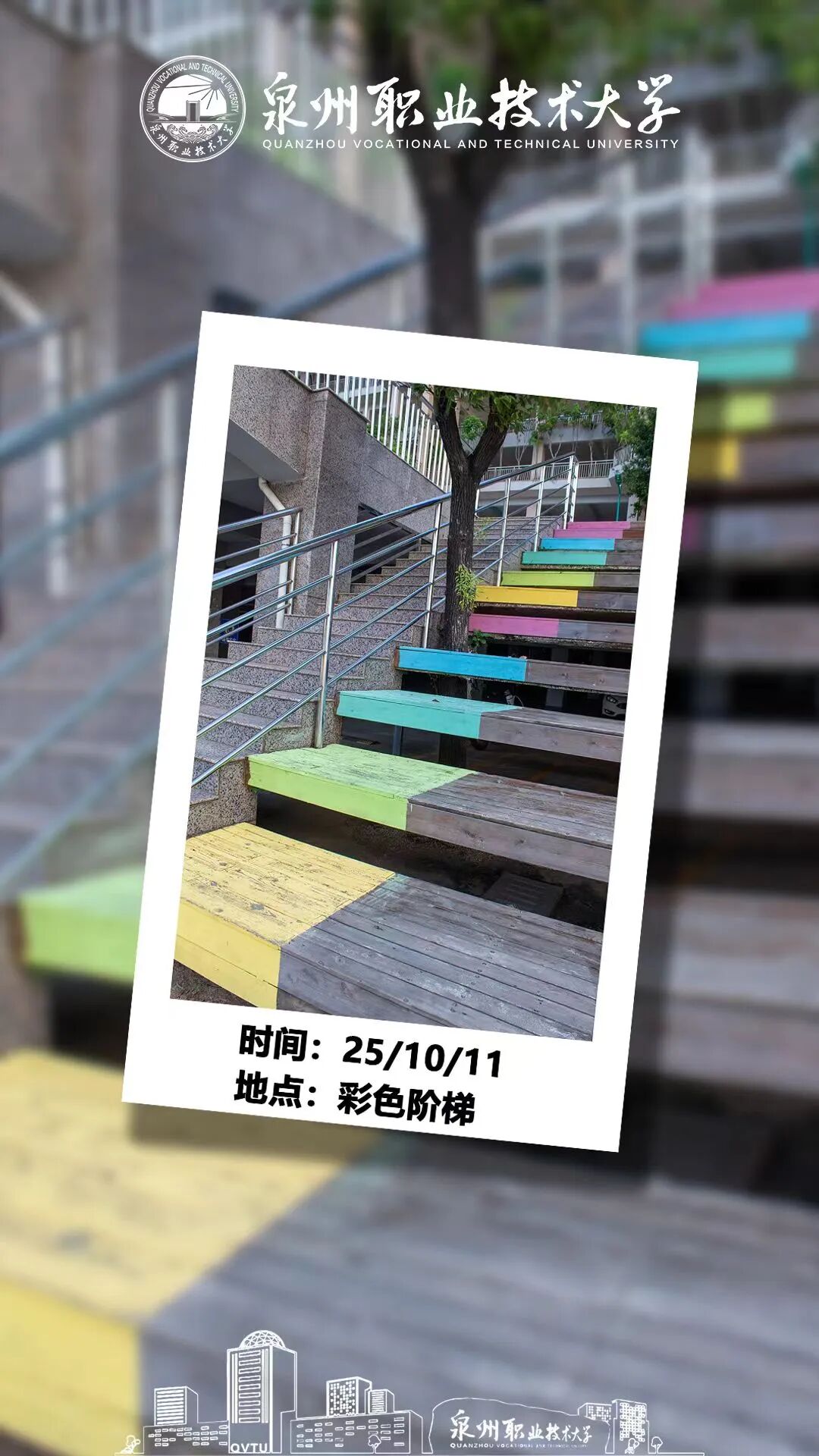 像把彩虹裁成了台阶,绿、黄、蓝的色块在阳光下格外鲜亮,仿佛行走在调色板上。坐在阶梯上微笑,背后是跳跃的色彩,眼前是校园的风景,每一张照片都充满活力。无论是俯拍全景展现阶梯的绚丽,还是仰拍捕捉阳光与色彩的碰撞,都能让画面瞬间生动起来。这里不仅是拍照胜地,更是同学们课间休息、交流的好去处,色彩与笑声交织成校园最明快的记忆。