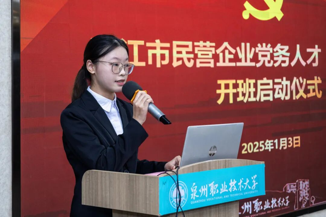 来自酒店管理专业的廖晓兰同学作为学员代表发言。她表示,将珍惜此次培训机会,不断提高自己的政治觉悟和理论水平,认真学习党务工作的相关知识和技能,积极在党务实践中提升自己的党务工作水平。扎根晋江、服务晋江,努力成为晋江民营企业的新生力量,助力新兴领域党建、行业协会商会党的建设和改革发展。