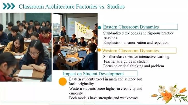 讲座中,David凭借对东西方教育模式的学习了解和自身经验,通过对比分析、案例解读及技术前沿展望,展现了学生视角下的教育创新思考。东方教育:强调标准化教材、高强度练习与知识记忆,学生在数理化学科表现优异,但原创性可能受限;西方教育:注重小班互动、批判性思维与创造力培养,学生更具探索精神,但基础学科能力需加强。他还以中国“双减政策”、新加坡“少教多学”等改革为例,解析亚洲国家如何吸纳西方教育理念,提升学生创造力;同时,英国引入上海数学教学法、法国强化重复学习等案例,则体现了西方国家借鉴东方结构化教学的优势。“教育不仅是知识的传递,更是文化与思维的碰撞。希望通过这次分享,激发更多同龄人对教育改革的关注。”David在开场中说道。