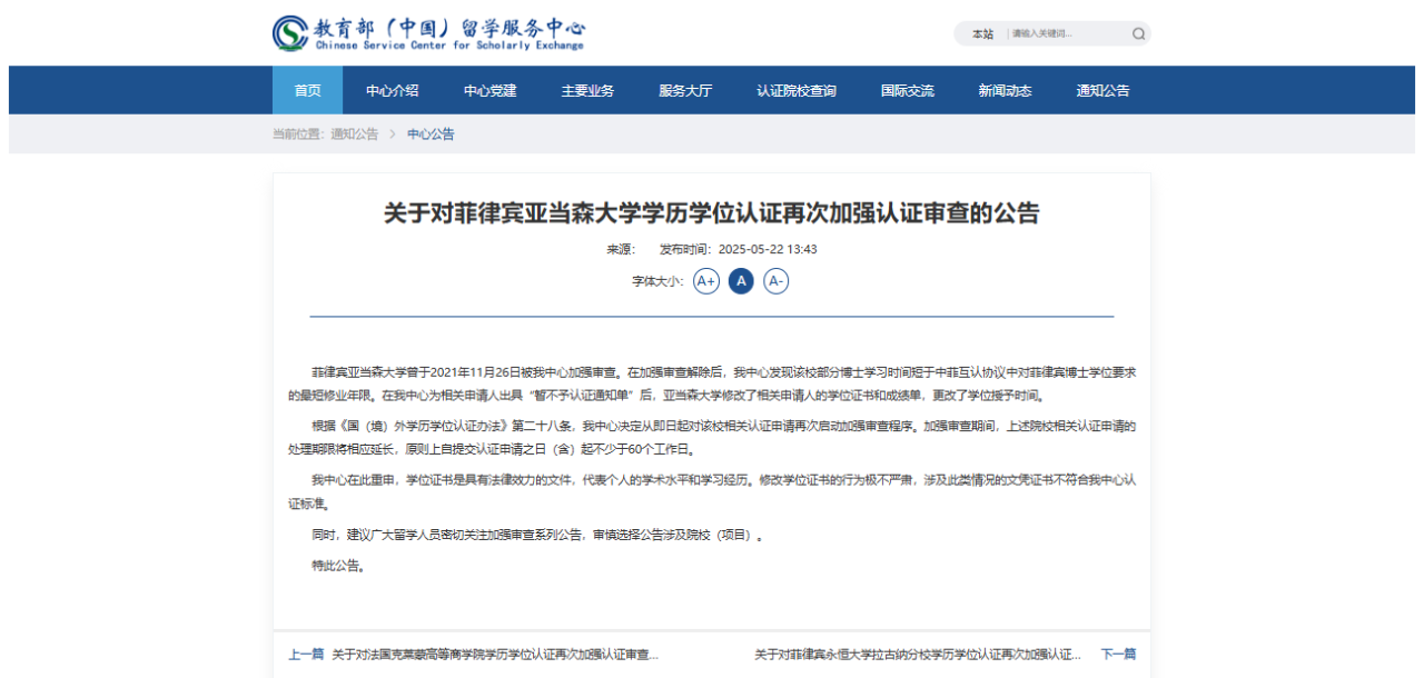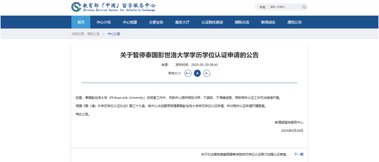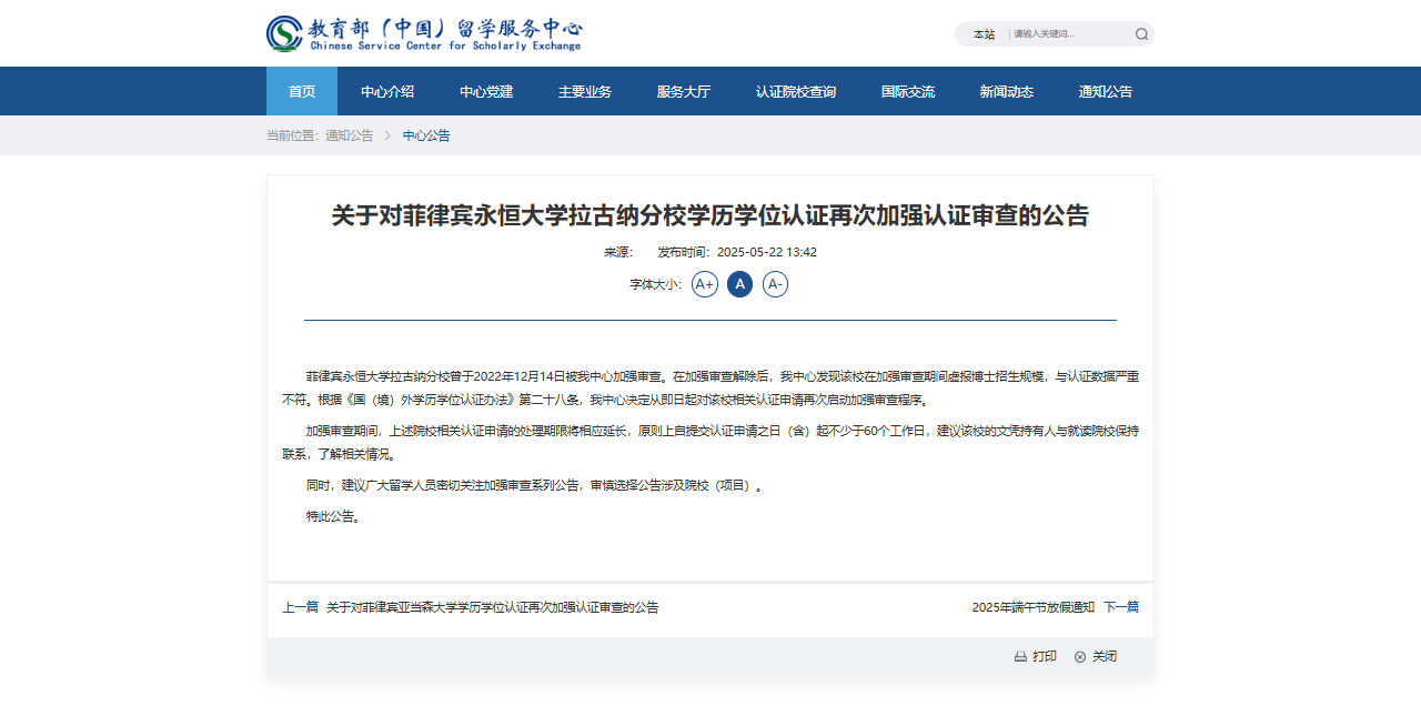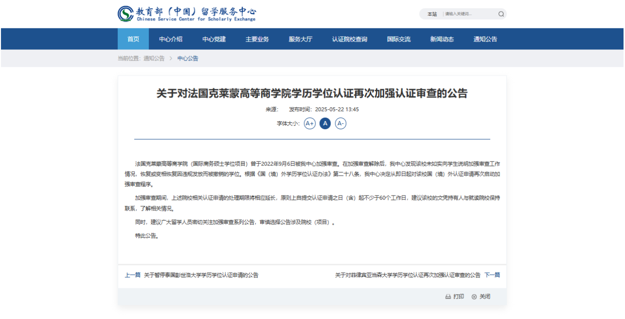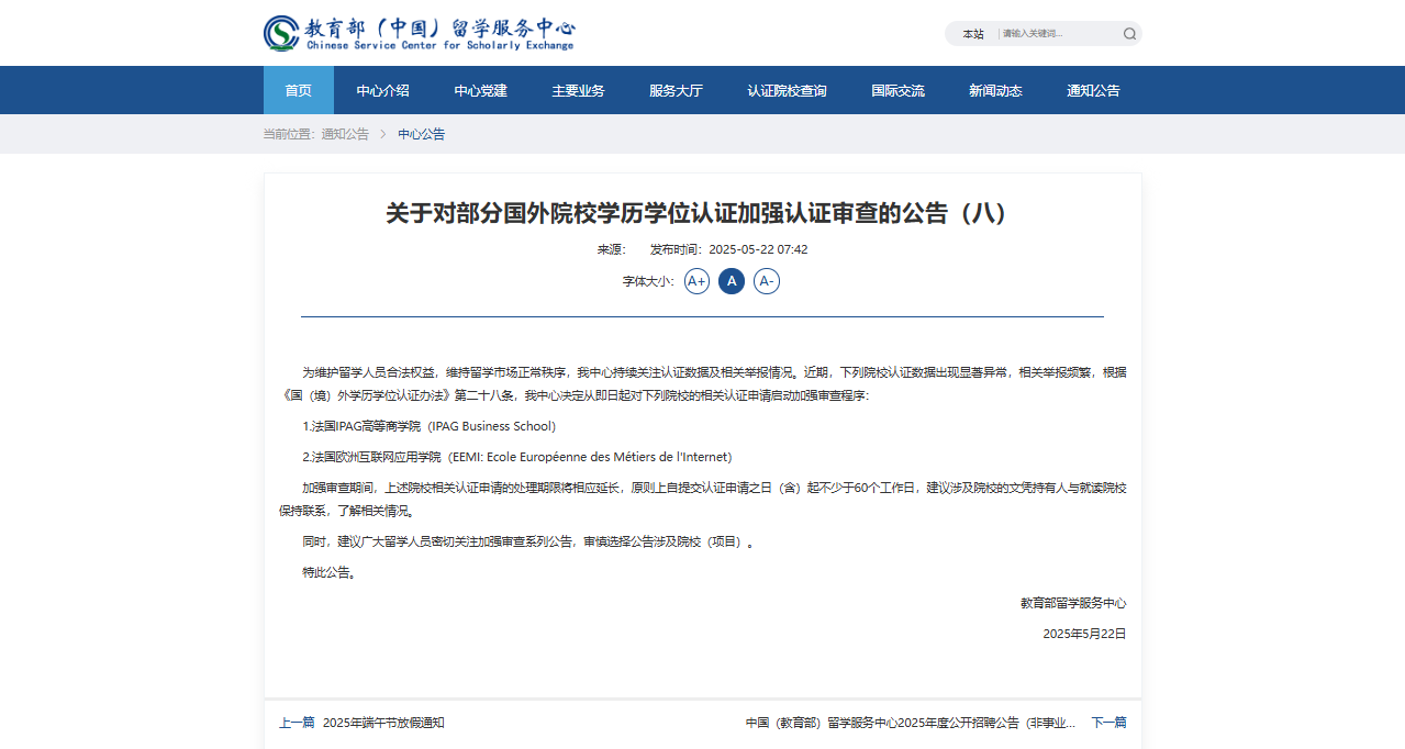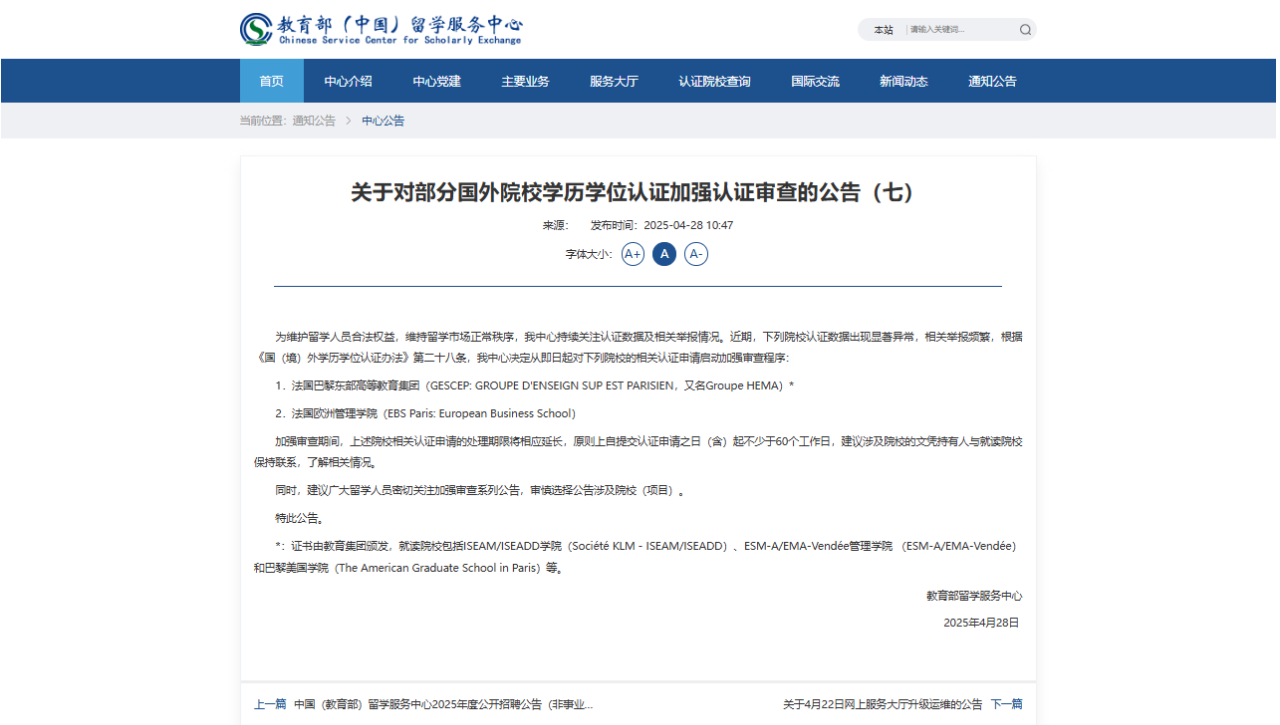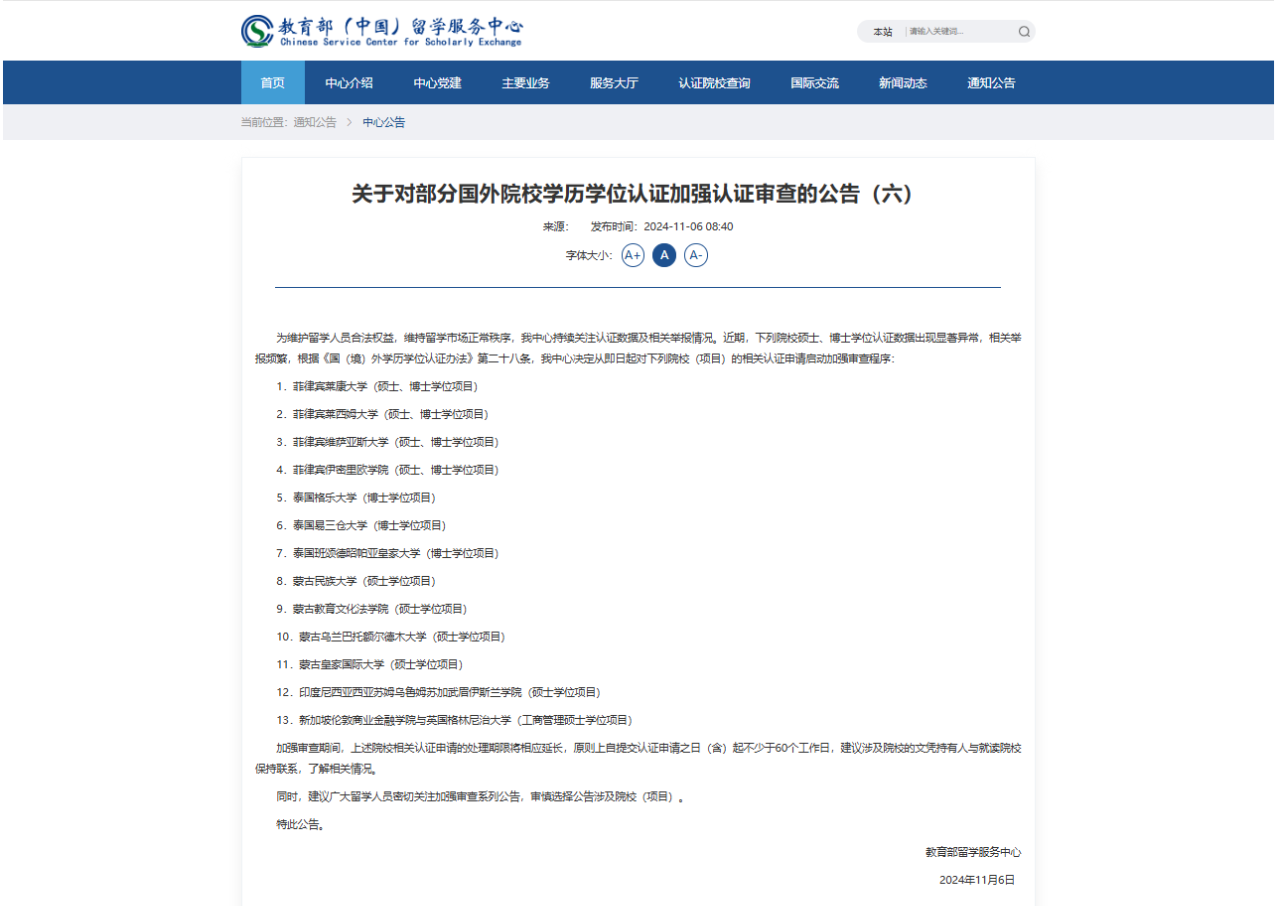 为维护留学人员合法权益,维持留学市场正常秩序,教育部留学服务中心(以下简称“中心”)持续关注认证数据及相关举报情况。与2024年11月6号至2025年5月29号持续更新硕士、博士学位认证数据出现显著异常的几所海外院校,中心将对相关院校(项目)的相关认证申请启动加强审查程序。