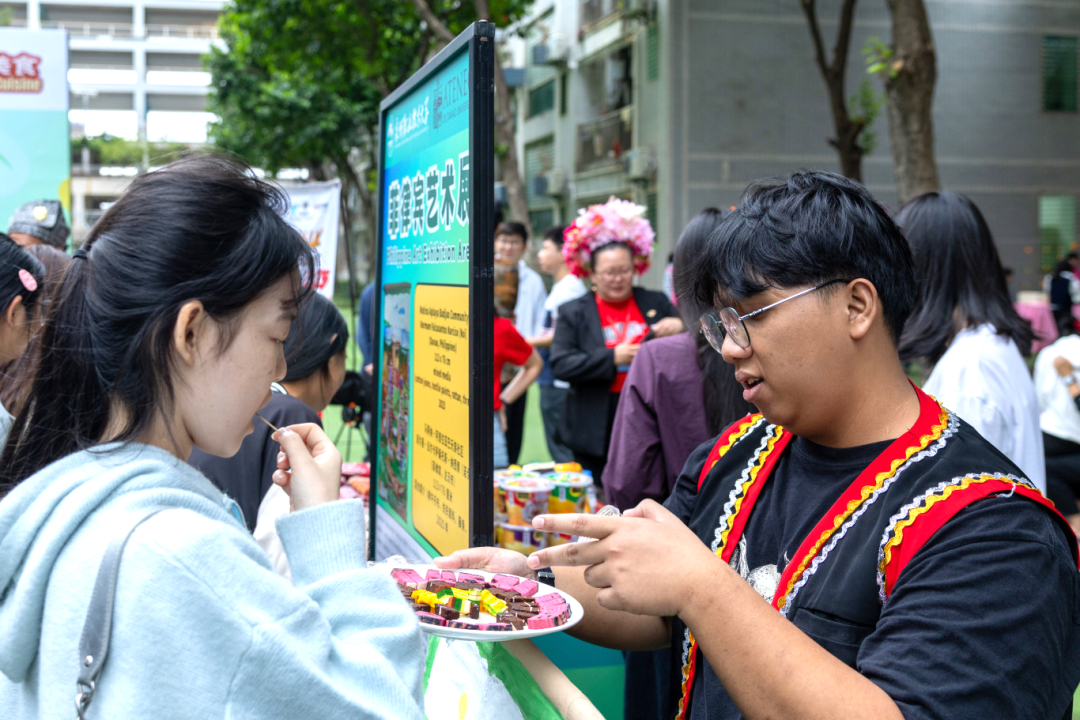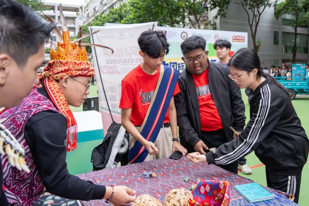 除了味蕾的享受,文化互动体验区同样人头攒动。泉州非遗簪花、剪纸体验,沙捞越串珠项链等展示,及不同国家的传统游戏,让师生在亲手体验中感受不同文化的魅力。师生们手持集章卡,穿梭于各个区域,在社交平台分享所见所闻,现场洋溢着青春的活力与跨文化交融的喜悦。“真诚希望来自中国、马来西亚、菲律宾和泰国四个国家的同学们,能利用这个活动机会,去了解他们从未接触过的世界和文化。”泰国乌汶大学教师代表TOMON LINAHATRAKUL说,愿同学们将这段经历视为个人成长的宝贵一课,让他们能过上有意义的生活,并在未来继续彼此尊重、相互欣赏。