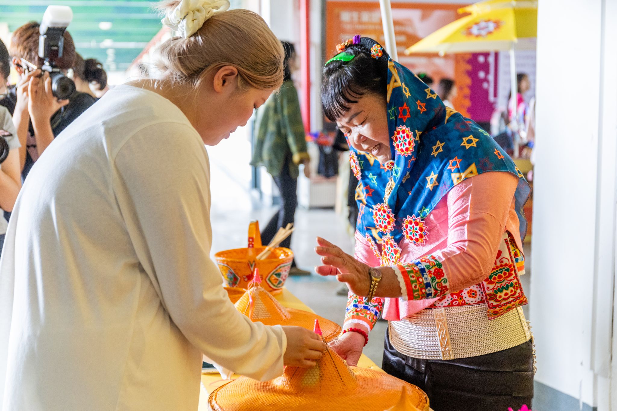 秀场之外,惠安女斗笠制作、竹编技艺等非遗课堂同步开展。非遗传承人现场讲解、示范师生亲手体验,从编织到穿搭,从纹样到寓意,非遗成为可触可感的技艺。