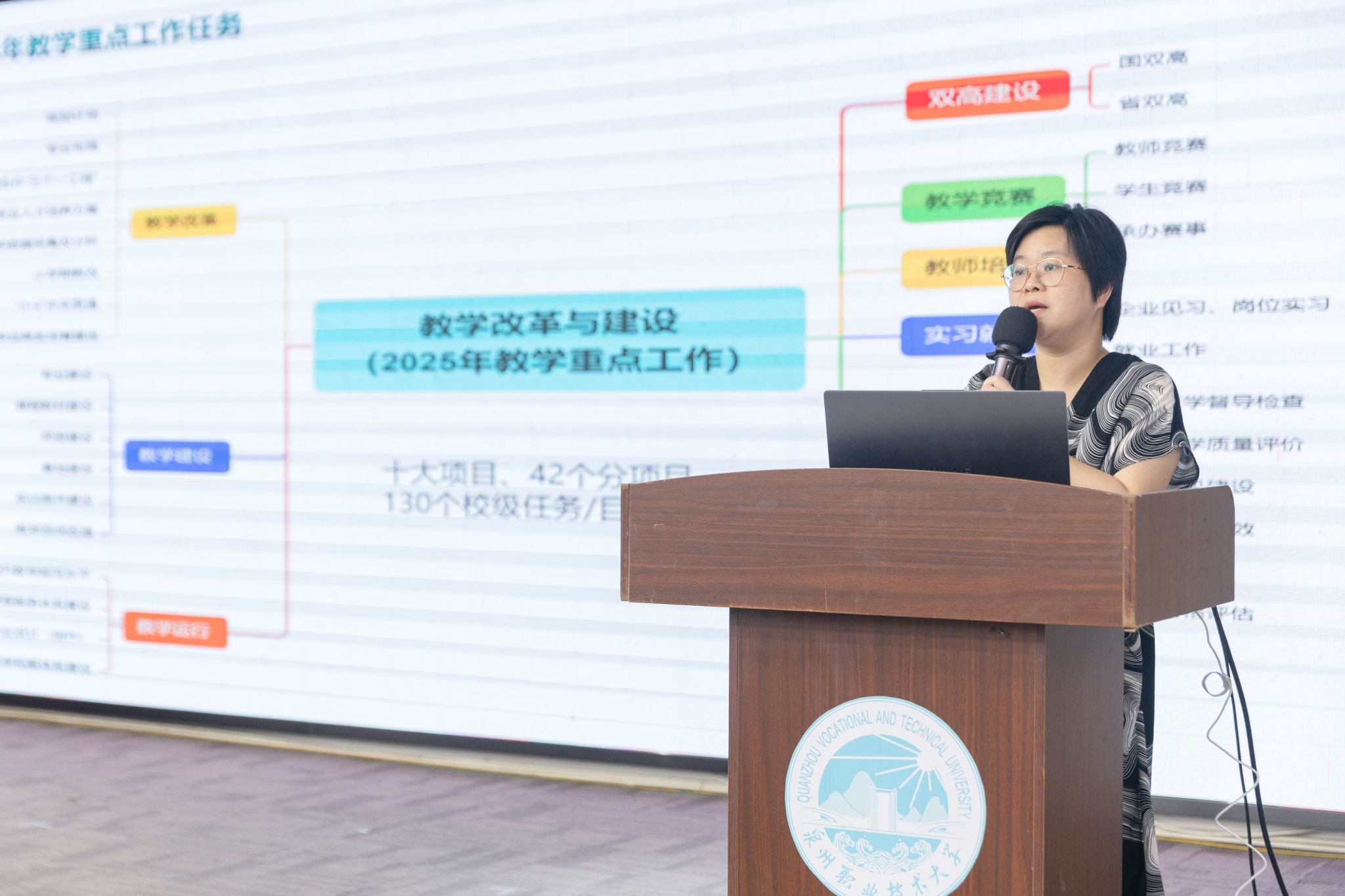 校长助理、教务处处长苏康敏系统梳理了教学重点工作进展,重点围绕合格评估指标要求,“以评促建、以评促强”为核心导向,聚焦专业、课程、实验实训强化及校企“双元育人”机制深化等关键环节,驱动教育教学内涵持续提升。她强调,教学管理部门将坚定以合格评估为抓手,引导教师夯实课堂主阵地,强化校企协同与课程思政建设,将各项改革举措切实转化为落实立德树人根本任务的扎实成效。