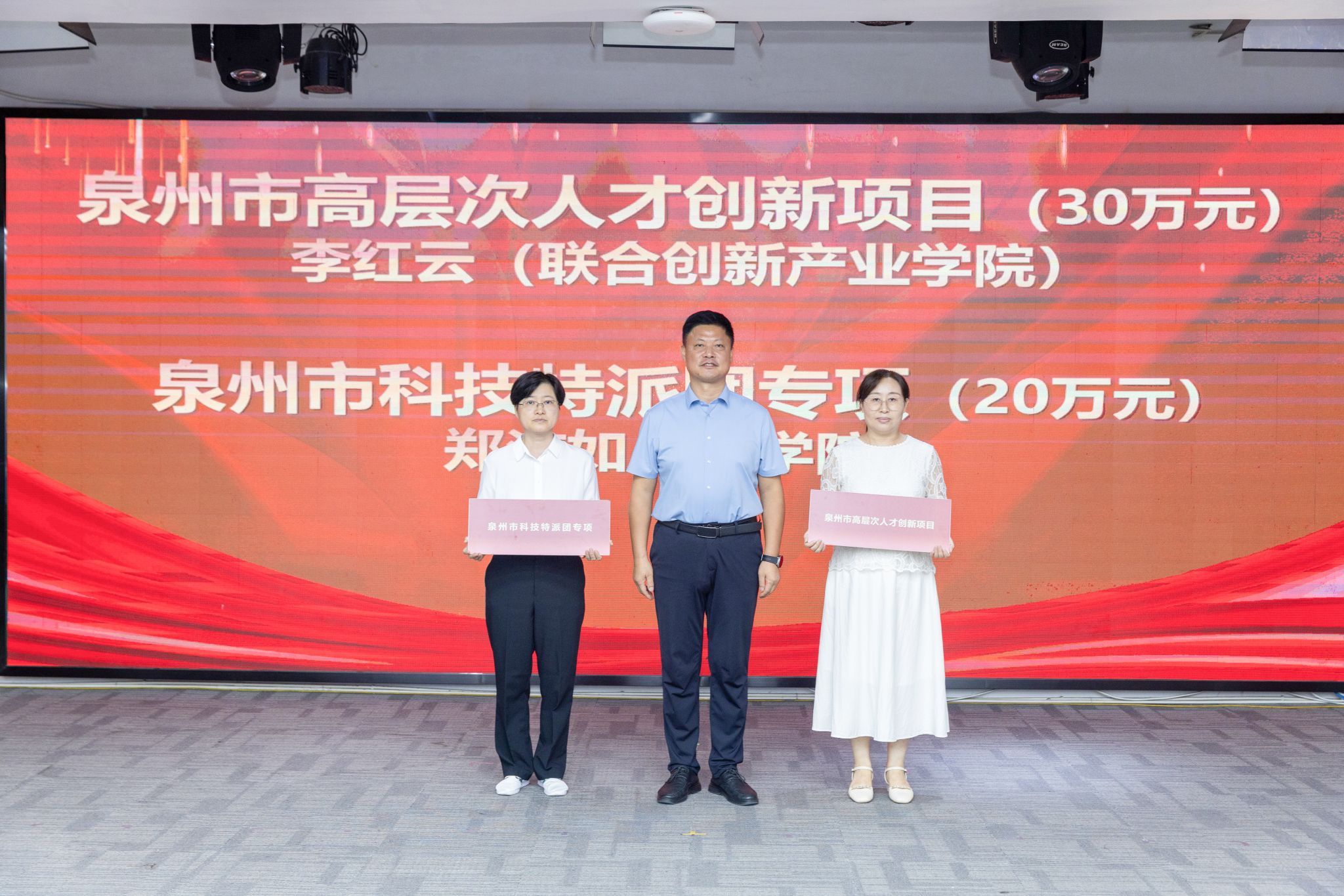 ▲ 副校长张建军为泉州市高层次人才创新项目获得者李红云、泉州市科技特派团专项获得者郑洁如颁奖和授牌