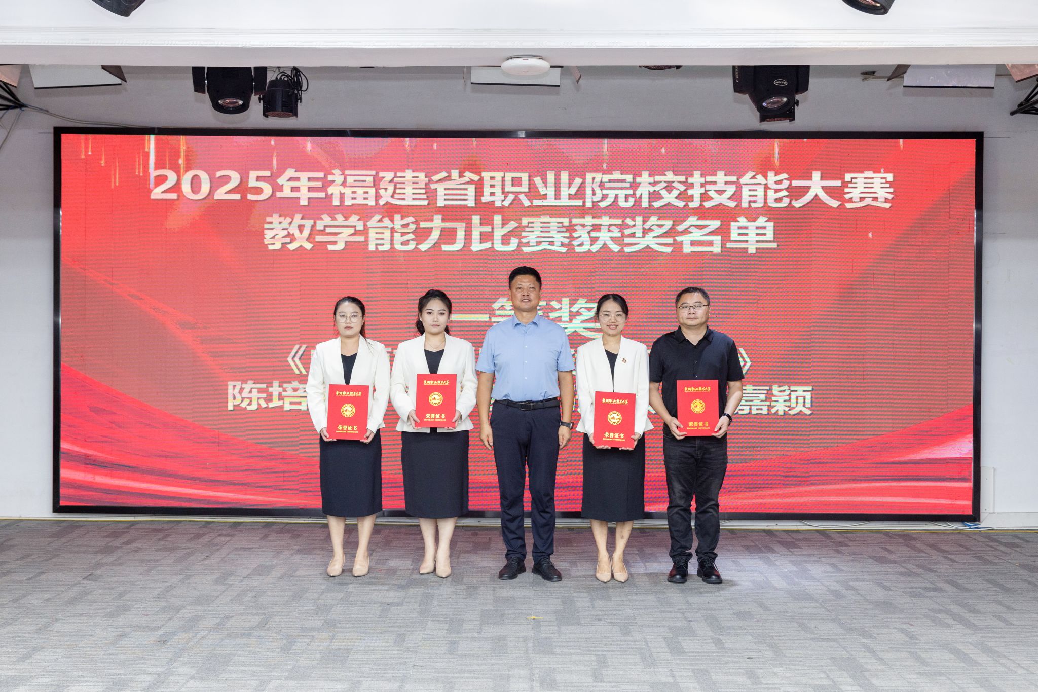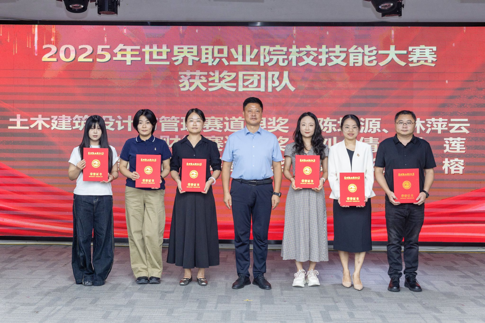 ▲ 副校长张建军为2025年福建省职业院校技能大赛教学能力比赛一等奖、2025年世界职业院校技能大赛土木建筑设计管理赛道银奖获奖团队颁奖