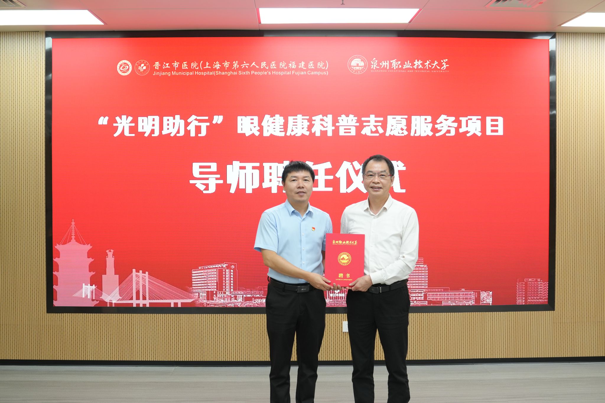 为进一步提升志愿服务的专业水平,现场还特别举行了“光明助行”眼健康科普志愿服务项目导师聘任仪式。蔡金佩为晋江市医院眼科主任林水龙颁发聘书,正式聘请其担任该志愿服务队的专业导师,为项目提供专业的眼健康知识指导与培训,同时邀请眼科护士长陈瑞也为志愿者做眼科布局介绍、就诊流程、日间手术流程的培训,让志愿服务更加贴近临床,展现晋医服务温度。