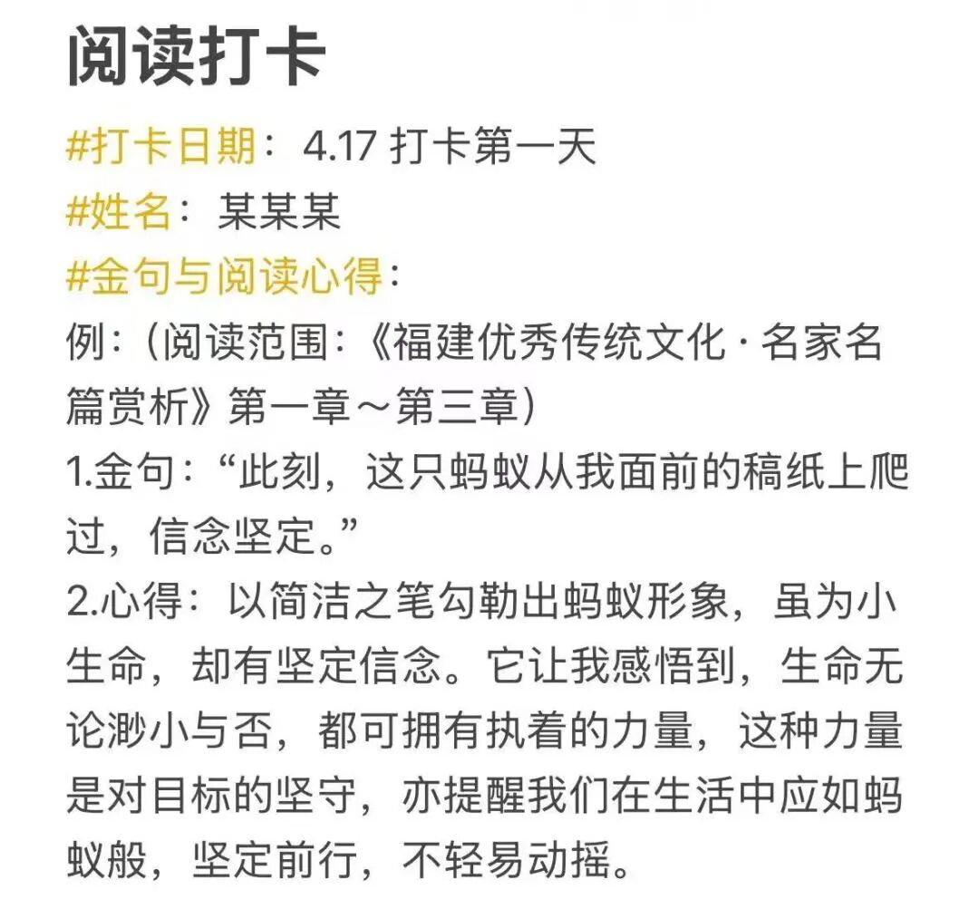 1.七天共读打卡:以小组为单位互助共读,按照固定格式发至共读群,共读结束后根据小组成员打卡情况,统计小组成绩,计入评比总分。(必选)