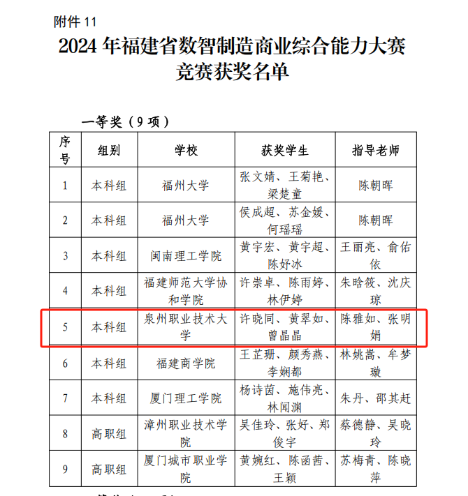 我院代表队由2022级大数据与财务管理专业的许晓同、曾晶晶、黄翠如组成,他们凭借扎实的专业知识和实践技能、出色的团队协作能力,在此次大赛中表现卓越、脱颖而出,排名第五,荣获一等奖。指导老师为陈雅如、张明娟。这一成绩是对三位同学以及指导老师辛勤付出的最好回报,也是泉州职业技术大学商学院在数智制造商业综合能力方面实力的一次充分展示。